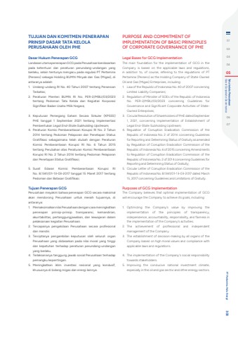 TUJUAN DAN KOMITMEN PENERAPAN PRINSIP DASAR TATA KELOLA PERUSAHAAN OLEH PHEDasar Hukum Penerapan GCGLandasan utama penerapan GCG pada Perusahaan berdasarkan pada ketentuan dan peraturan perundang-undangan yang berlaku, selain tentunya mengacu pada regulasi PT Pertamina (Persero) sebagai Holding BUMN Minyak dan Gas (Migas), di antaranya adalah:1. Undang-undang RI No. 40 Tahun 2007 tentang Perseroan Terbatas;2. Peraturan Menteri BUMN RI No. PER-2/MBU/03/2023 tentang Pedoman Tata Kelola dan Kegiatan Korporasi Signifikan Badan Usaha Milik Negara;3. Keputusan Pemegang Saham Secara Sirkuler (KPSSS) PHE tanggal 1 September 2021 tentang Implementasi Pembentukan Legal End-State Subholding Upstream;4. Peraturan Komisi Pemberantasan Korupsi RI No. 2 Tahun 2014 tentang Pedoman Pelaporan dan Penetapan Status Gratifikasi sebagaimana telah diubah dengan Peraturan Komisi Pemberantasan Korupsi RI No. 6 Tahun 2015 tentang Perubahan atas Peraturan Komisi Pemberantasan Korupsi RI No. 2 Tahun 2014 tentang Pedoman Pelaporan dan Penetapan Status Gratifikasi;5. Surat Edaran Komisi Pemberantasan Korupsi RI No. B.1341/01-13-03-2017 tanggal 15 Maret 2017 tentang Pedoman dan Batasan Gratifikasi.Tujuan Penerapan GCGPerusahaan meyakini bahwa penerapan GCG secara maksimal akan mendorong Perusahaan untuk meraih tujuannya, di antaranya:1. Memaksimalkan nilai Perusahaan dengan cara meningkatkan penerapan prinsip-prinsip transparansi, kemandirian, akuntabilitas, pertanggungjawaban, dan kewajaran dalam pelaksanaan kegiatan Perusahaan.2. Tercapainya pengelolaan Perusahaan secara profesional dan mandiri.3. Terciptanya pengambilan keputusan oleh seluruh organ Perusahaan yang didasarkan pada nilai moral yang tinggi dan kepatuhan terhadap peraturan perundang-undangan yang berlaku.4. Terlaksananya tanggung jawab sosial Perusahaan terhadap pemangku kepentingan.5. Meningkatkan iklim investasi nasional yang kondusif, khususnya di bidang migas dan energi lainnya.PURPOSE AND COMMITMENT OF IMPLEMENTATION OF BASIC PRINCIPLES OF CORPORATE GOVERNANCE OF PHELegal Bases for GCG ImplementationThe main foundation for the implementation of GCG in the Company is based on the applicable laws and regulations, in addition to, of course, referring to the regulations of PT Pertamina (Persero) as the Holding Company of State-Owned Oil and Gas (Migas) Enterprises, including:1. Law of the Republic of Indonesia No. 40 of 2007 concerning Limited Liability Companies;2. Regulation of Minister of SOEs of the Republic of Indonesia No. PER-2/MBU/03/2023 concerning Guidelines for Governance and Significant Corporate Activities of StateOwned Enterprises;3. Circular Resolution of Shareholders of PHE dated September 1, 2021, concerning Implementation of Establishment of Legal End-State Subholding Upstream;4. Regulation of Corruption Eradication Commission of the Republic of Indonesia No. 2 of 2014 concerning Guidelines for Reporting and Determining Status of Gratuity as amended by Regulation of Corruption Eradication Commission of the Republic of Indonesia No. 6 of 2015 concerning Amendments to Regulation of Corruption Eradication Commission of the Republic of Indonesia No. 2 of 2014 concerning Guidelines for Reporting and Determining Status of Gratuity;5. Circular Letter of Corruption Eradication Commission of the Republic of Indonesia No. B.1341/01-13-03-2017 dated March 15, 2017 concerning Guidelines and Limitations of Gratuity.Purposes of GCG ImplementationThe Company believes that optimal implementation of GCG will encourage the Company to achieve its goals, including:1. Optimizing the Company's value by improving the implementation of the principles of transparency, independence, accountability, responsibility, and fairness in the implementation of the Company's activities.2. The achievement of professional and independent management of the Company.3. The establishment of decision-making by all organs of the Company based on high moral values and compliance with applicable laws and regulations.4. The implementation of the Company's social responsibility towards stakeholders.5. Improving the conducive national investment climate, especially in the oil and gas sector and other energy sectors.0102030405 Good Corporate Governance Tata kelola Perusahaan0607 PT Pertamina Hulu Energi 303