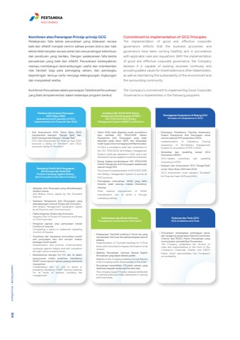 Pedoman dan Tools GCGGCG Guidelines and ToolsPenilaian dan Evaluasi Penerapan GCG Tahun 2024Assessment and Evaluation of GCG Implementation for Financial Year 2024Kampanye Positif Anti Penyuapan, Anti Korupsi dan Kode EtikPositive Campaign Against Bribery, Anti-Corruption and Code of ConductKomitmen atas Penerapan Prinsip-prinsip GCGPelaksanaan tata kelola perusahaan yang dilakukan secara baik dan efektif menjadi cermin bahwa proses bisnis dan tata kelola telah berjalan secara sehat dan sesuai dengan ketentuan dan peraturan yang berlaku. Dengan pelaksanaan tata kelola perusahaan yang baik dan efektif, Perusahaan berkeyakinan mampu membangun kesinambungan usaha dan memberikan nilai tambah bagi para pemegang saham, dan pemangku kepentingan lainnya serta menjaga kelangsungan lingkungan dan masyarakat sekitar.Komitmen Perusahaan dalam penerapan Tata Kelola Perusahaan yang Baik diimplementasi dalam beberapa program berikut.Commitment to Implementation of GCG PrinciplesThe implementation of good and effective corporate governance reflects that the business processes and governance have been running healthily and in accordance with applicable rules and regulations. With the implementation of good and effective corporate governance, the Company believes it is capable of building business continuity and providing added values for shareholders and other stakeholders, as well as maintaining the sustainability of the environment and the surrounding community.The Company's commitment to implementing Good Corporate Governance is implemented in the following programs.Peningkatan Kompetensi di Bidang GCGIncrease of Competence in GCGKeterbukaan dan Akses InformasiTransparency and Access to InformationSertifikasi ISO 37001:2016 Sistem Manajemen Anti Penyuapan (SMAP)ISO 37001:2016 Anti-Bribery Management System (ABMS) Certification%u2022 Kebijakan Anti Penyuapan yang ditandatangani Direktur Utama.Anti-Bribery Policy signed by the President Director.%u2022 Deklarasi Manajemen Anti Penyuapan yang ditandatangani seluruh Direksi dan Komisaris.Anti-Bribery Management Declaration signed by all Directors and Commissioners.%u2022 Pakta Integritas Direksi dan Komisaris.Integrity Pact of Board of Directors and Board of Commissioners.%u2022 Pengisian laporan atau pernyataan terkait Conflict of Interest.Completing a report or statement regarding Conflict of Interest.%u2022 Sosialisasi dan kampanye komunikasi positif anti penyuapan dan anti korupsi melalui berbagai event kreatif.Dissemination and positive communication campaign against bribery and anti-corruption through various creative event.%u2022 Berkolaborasi dengan tim HC dan IA dalam penyusunan materi pelatihan mandatorySMAP untuk seluruh lapisan pekerja termasuk manajemen.Collaborating with HC and IA teams in preparing mandatory SMAP training materials for all levels of workers including the management.%u2022 Pelaksanaan Townhall meeting 5 (lima) kali yang memberikan informasi Perusahaan kepada seluruh pekerja.Implementation of Townhall meetings for 5 (five) times which provided Company information for all workers.%u2022 Website Perusahaan memuat Annual ReportPerusahaan yang dapat diakses publik.Website of the Company publishes Annual Reports of the Company which are accessible to the public.%u2022 Perusahaan menerbitkan 113 press release yang disalurkan kepada media nasional dan lokal.The company issued 113 press releases distributed to national and local media distributed to national and local media.%u2022 Perusahaan menetapkan pembagian peran dan tanggung jawab dalam bentuk Corporate Charter dan RASCI Matrix Perusahaan yang menunjukkan akuntabilitas Perusahaan. The Company establishes the division of roles and responsibilities in the form of the Company's Corporate Charter and RASCI Matrix which demonstrates the Company's accountability. %u2022 Self Assessment GCG Tahun Buku 2023 memperoleh kategori %u201cSangat Baik%u201d dan 2024 memperoleh kategori %u201cSangat Baik%u201d. GCG Self-Assessment for Financial Year 2023 received a rating of %u201cExcellent%u201d and 2024 received a rating of %u201cExcellent%u201d. %u2022 Tahun 2024 telah dilakukan audit surveillanceatas sertifikat ISO 37001:2016 Sistem Manajemen Anti Penyuapan yang telah diperoleh pada tahun 2023, dan dinyatakan masih layak untuk memegang sertifikat tersebut.In 2024, a surveillance audit was conducted on the ISO 37001:2016 Anti-Bribery Management System certificate obtained in 2023, and it was declared to remain eligible to hold the certificate.%u2022 Ruang lingkup pemberlakuan ISO 37001:2016 Sistem Manajemen Anti Penyuapan adalah pada seluruh fungsi PHE.The scope of implementation of ISO 37001:2016 Anti-Bribery Management System is across all PHE functions.%u2022 Peningkatan internalisasi SMAP yang lebih massive salah satunya melalui mandatory training.More massive improvement of SMAP internalization, one of which is through mandatory training.%u2022 Penerapan Mandatory Training AwarenessSistem Manajemen Anti Penyuapan untuk seluruh pekerja PHE pada tahun 2024.Implementation of Mandatory Training Awareness of Anti-Bribery Management System for all workers of PHE in 2024.%u2022 Workshop dan Upskilling terkait GCG (termasuk LHKPN).GCG-related workshops and upskilling (including LHKPN).%u2022 Kategori skor Assessment GCG %u201cSangat Baik%u201d untuk Tahun Buku 2023 dan 2024. GCG Assessment score category %u201cExcellent%u201d for Financial Years 2023 and 2024.Laporan Tahunan %u2022 Annual Report 304HULU ENERGI