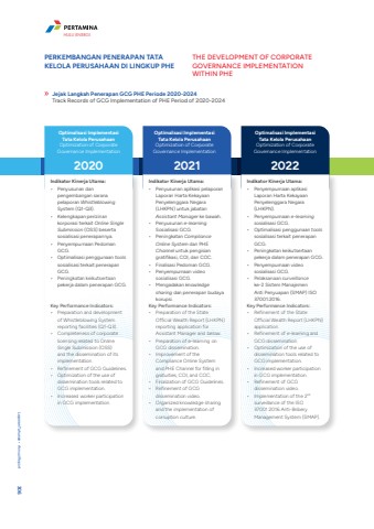 Jejak Langkah Penerapan GCG PHE Periode 2020-2024Track Records of GCG Implementation of PHE Period of 2020-2024PERKEMBANGAN PENERAPAN TATA KELOLA PERUSAHAAN DI LINGKUP PHETHE DEVELOPMENT OF CORPORATE GOVERNANCE IMPLEMENTATION WITHIN PHEOptimalisasi Implementasi Tata Kelola PerusahaanOptimization of Corporate Governance Implementation2020 2021 2022Indikator Kinerja Utama:%u2022 Penyusunan dan pengembangan sarana pelaporan WhistleblowingSystem (Q1-Q3). %u2022 Kelengkapan perizinan korporasi terkait Online Single Submission (OSS) beserta sosialisasi penerapannya. %u2022 Penyempurnaan Pedoman GCG. %u2022 Optimalisasi penggunaan tools sosialisasi terkait penerapan GCG.%u2022 Peningkatan keikutsertaan pekerja dalam penerapan GCG.Key Performance Indicators:%u2022 Preparation and development of Whistleblowing System reporting facilities (Q1-Q3).%u2022 Completeness of corporate licensing related to Online Single Submission (OSS) and the dissemination of its implementation.%u2022 Refinement of GCG Guidelines.%u2022 Optimization of the use of dissemination tools related to GCG implementation.%u2022 Increased worker participation in GCG implementation.Indikator Kinerja Utama:%u2022 Penyusunan aplikasi pelaporan Laporan Harta Kekayaan Penyelenggara Negara (LHKPN) untuk jabatan Assistant Manager ke bawah. %u2022 Penyusunan e-learningSosialisasi GCG. %u2022 Peningkatan Compliance Online System dan PHE Channel untuk pengisian gratifikasi, COI, dan COC. %u2022 Finalisasi Pedoman GCG.%u2022 Penyempurnaan video sosialisasi GCG. %u2022 Mengadakan knowledge sharing dan penerapan budaya korupsi.Key Performance Indicators:%u2022 Preparation of the State Official Wealth Report (LHKPN) reporting application for Assistant Manager and below.%u2022 Preparation of e-learning on GCG dissemination. %u2022 Improvement of the Compliance Online System and PHE Channel for filling in gratuities, COI, and COC.%u2022 Finalization of GCG Guidelines.%u2022 Refinement of GCG dissemination video.%u2022 Organized knowledge sharing and the implementation of corruption culture.Indikator Kinerja Utama: %u2022 Penyempurnaan aplikasi Laporan Harta Kekayaan Penyelenggara Negara (LHKPN).%u2022 Penyempurnaan e-learning sosialisasi GCG. %u2022 Optimalisasi penggunaan tools sosialisasi terkait penerapan GCG. %u2022 Peningkatan keikutsertaan pekerja dalam penerapan GCG.%u2022 Penyempurnaan video sosialisasi GCG. %u2022 Pelaksanaan surveillanceke-2 Sistem Manajemen Anti Penyuapan (SMAP) ISO 37001:2016.Key Performance Indicators:%u2022 Refinement of the State Official Wealth Report (LHKPN) application.%u2022 Refinement of e-learning and GCG dissemination. %u2022 Optimization of the use of dissemination tools related to GCG implementation.%u2022 Increased worker participation in GCG implementation.%u2022 Refinement of GCG dissemination video.%u2022 Implementation of the 2ndsurveillance of the ISO 37001:2016 Anti-Bribery Management System (SMAP).Optimalisasi Implementasi Tata Kelola PerusahaanOptimization of Corporate Governance ImplementationOptimalisasi Implementasi Tata Kelola PerusahaanOptimization of Corporate Governance ImplementationLaporan Tahunan %u2022 Annual Report 306HULU ENERGI