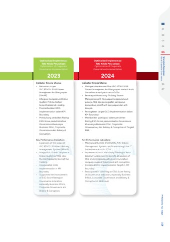 2023 2024Indikator Kinerja Utama: %u2022 Perluasan scopeISO 370001:2016 Sistem Manajemen Anti Penyuapan (SMAP).%u2022 Integrasi Compliance Online System PHE ke Sistemtersentralisasi di Holding.%u2022 Mencantumkan GCG Implementation dalam KPI Boundary.%u2022 Mendukung perbaikan RatingESG Score pada Indicators Governance khususnya Business Ethic, Corporate Governance dan Bribery & Corruption.Key Performance Indicators:%u2022 Expansion of the scope of ISO 370001:2016 Anti-Bribery Management System (ABMS).%u2022 Integration of the Compliance Online System of PHE into the Centralized System at the Holding.%u2022 Incorporated GCG Implementation in KPI Boundary.%u2022 Supported the improvement of ESG Score Rating on Governance Indicators, especially Business Ethics, Corporate Governance and Bribery & Corruption.Optimalisasi Implementasi Tata Kelola PerusahaanOptimization of Corporate Governance ImplementationOptimalisasi Implementasi Tata Kelola PerusahaanOptimization of Corporate Governance ImplementationIndikator Kinerja Utama:%u2022 Mempertahankan sertifikat ISO 37001:2016 Sistem Manajemen Anti Penyuapan melalui Audit Surveillance ke-1 pada tahun 2024.%u2022 Penerapan Mandatory Training Sistem Manajemen Anti Penyuapan kepada seluruh pekerja PHE dan peningkatan kampanye komunikasi positif anti penyuapan dan anti korupsi.%u2022 Peningkatan target GCG Implementation dalam KPI Boundary.%u2022 Memberikan partisipasi dalam perolehan Rating ESG Score pada indikator Governancekhususnya Business Ethic, Corporate Governance, dan Bribery & Corruption di Tingkat BBB.Key Performance Indicators:%u2022 Maintained the ISO 37001:2016 Anti-Bribery Management System certificate through the 1stSurveillance Audit in 2024.%u2022 Implementation of Mandatory Training of AntiBribery Management System to all workers of PHE and increased positive communication. campaign against bribery and anti-corruption%u2022 Increased GCG Implementation target in KPI Boundary.%u2022 Participated in obtaining an ESG Score Rating on Governance indicators, especially Business Ethics, Corporate Governance, and Bribery & Corruption at BBB Level.0102030405 Good Corporate Governance Tata kelola Perusahaan0607 PT Pertamina Hulu Energi 307