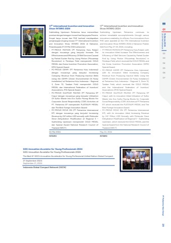 17th International Invention and Innovation Show INTARG 2024 17th International Invention and Innovation Show INTARG 2024 Subholding Upstream Pertamina terus menorehkan prestasi dengan beragam inovasi hasil karya para Perwira. Empat karya inovasi dari PHE berhasil mendapatkan penghargaan di ajang inovasi 17th International Invention and Innovation Show INTARG 2024 di Katowice, Polandia pada 21-23 Mei 2024 antara lain:%u2022 FT-PROVE MOTION (PT Pertamina Hulu Rokan) dengan inovasinya yang berjudul Increase The Effectiveness and Efficiency Of Well Services Caused by Parted Sucker Rod by Using Motion (Mousetrap Revolution) in Pendopo Field memperoleh GOLD MEDAL dan Korea Invention Promotion Association, KIPA Special Award. %u2022 PC-PROVE GEMPI (PT Pertamina Hulu Indonesia) dengan inovasinya yang berjudul Increasing Company Revenue from Producing Inactive Wells Using the GEMPI (Green Environmental Oil Pump Installation) at Pertamina Hulu Indonesia %u2013 Regional 3, Zone 10, Tarakan Field memperoleh GOLD MEDAL dan International Federation of Inventors%u2019 Associations, IFIA Special Award.%u2022 PC-PROVE SULPHUR PAVING (PT Pertamina EP Cepu) dengan inovasinya yang berjudul Utilization Of Sulfur Waste Into Eco Sulfur Paving Blocks For Corporate Social Responsibility (CSR) Activities atPT. Pertamina EP memperoleh PLATINUM MEDAL dan The Best Foreign Innovation Award.%u2022 PC-PROVE MOVE ON (PT Pertamina Internasional EP) dengan inovasinya yang berjudul Increasing Revenue by 241 million USD annually with Molecular Sieve Dehydration Modification at Regional 5 %u2013 Subholding Upstream memperoleh GOLD MEDAL dan Special Award National Research Council of Thailand (NRCT).24 Mei 2024INTARGSubholding Upstream Pertamina continues to achieve remarkable accomplishments through various innovations created by its officers. Four innovations from PHE were awarded at the 17th International Invention and Innovation Show INTARG 2024 in Katowice, Poland, held from May 21%u201323, 2024, including:%u2022 FT-PROVE MOTION (PT Pertamina Hulu Rokan), with its innovation titled Increase The Effectiveness and Efficiency of Well Services Caused by Parted Sucker Rod by Using Motion (Mousetrap Revolution) in Pendopo Field, which received the GOLD MEDAL and the Korea Invention Promotion Association (KIPA) Special Award.%u2022 PC-PROVE GEMPI (PT Pertamina Hulu Indonesia), with its innovation titled Increasing Company Revenue from Producing Inactive Wells Using the GEMPI (Green Environmental Oil Pump Installation) at Pertamina Hulu Indonesia %u2013 Regional 3, Zone 10, Tarakan Field, which received the GOLD MEDAL and the International Federation of Inventors%u2019 Associations (IFIA) Special Award.%u2022 PC-PROVE SULPHUR PAVING (PT Pertamina EP Cepu), with its innovation titled Utilization of Sulfur Waste into Eco Sulfur Paving Blocks for Corporate Social Responsibility (CSR) Activities at PT Pertamina EP, which received the PLATINUM MEDAL and The Best Foreign Innovation Award.%u2022 PC-PROVE MOVE ON (PT Pertamina Internasional EP), with its innovation titled Increasing Revenue by 241 Million USD Annually with Molecular Sieve Dehydration Modification at Regional 5 %u2013 Subholding Upstream, which received the GOLD MEDAL and the Special Award from the National Research Council of Thailand (NRCT).May 24, 2024INTARGSDG Innovation Accelator for Young Professionals 2024SDG Innovation Accelator for Young Professionals 2024The Best 6th SDG's Innovation Accelerator for Young Professional United Nation Global Compact.21 September 2024September 21, 2024Indonesia Global Compact Network (IGCN)01 2024 Performance Performa 2024020304050607Laporan Tahunan %u2022 Annual Report 28PT Pertamina Hulu Energi 29
