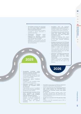 %u2022 Meningkatkan knowledge melalui kampanye komunikasi yang aktif terkait anti korupsi serta anti penyuapan Increase knowledge through the active communication campaign related to anticorruption and anti-bribery %u2022 Penyempurnaan aplikasi Compliance Online SystemCompletion of the Compliance Online System (COMPOLS) application%u2022 Pelaksanaan surveillance ke-2 Sistem Manajemen Anti Penyuapan (SMAP) ISO 37001:2016Implementation of the 2nd surveillance audit of the ISO 37001:2016 Anti-Bribery Management System (ABMS)%u2022 Perluasan penerapan mandatory training Sistem Manajemen Anti Penyuapan kepada pekerja di Anak Perusahaan lingkungan Subholding UpstreamExpansion of the implementation of mandatory Anti-Bribery Management System training to employees of subsidiaries within the Upstream Subholding%u2022 Meningkatkan kampanye anti penyuapan dan anti korupsi kepada stakeholderseksternal Subholding UpstreamEnhancing anti-bribery and anti-corruption campaigns to external stakeholders of Upstream Subholding%u2022 Melaksanakan sinkronisasi proses pengendalian gratifikasi melalui mekanisme UPG Subholding Upstreamuntuk PHE dan Anak PerusahaanImplementing synchronization of the gratification control process through the UPG Subholding Upstream mechanism for PHE and Subsidiaries20262025%u2022 Pemutakhiran atau penyusunan Pedoman terkait GCG Updating or drafting GCG-related guidelines%u2022 Seluruh regional dan AP Hulu di Subholding Upstreamtelah memiliki sertifikat ISO 37001:2016 Sistem Manajemen Anti Penyuapan dengan ruang lingkup seluruh fungsiAll regional and upstream business units in the Subholding Upstream have ISO 37001:2016 AntiBribery Management System certificates with a scope covering all functions%u2022 Kenaikan skor assesment GCG PHE pada tahun fiskal 2024Increase in the GCG assessment score of PHE in Financial Year 2024%u2022 Peningkatan fiture dan functional Compliance Online System (COMPOLS)Enhanced features and functionality of Compliance Online System (COMPOLS)%u2022 Pemutakhiran atau penyusunan Pedoman terkait GCG dengan integrasi yang komprehensif untuk seluruh lingkungan Subholding UpstreamUpdating or preparing GCG related Guidelines with comprehensive integration for the entire Upstream Subholding environment%u2022 Kenaikan skor assessment GCG PHE pada Tahun Buku 2025 melalui self assessmentriviu terhadap Area of Improvement yang didapat dari assessment Tahun Buku 2024Increase in PHE's GCG assessment score in the 2025 Financial Year through a self-assessment review of the Area of Improvement obtained from the 2024 Financial Year assessment%u2022 Pelaksanaan re-sertifikasi ISO terkait Anti Penyuapan, ISO 37001:2016 maupun pembaharuannya untuk ruang lingkup seluruh fungsiImplementation of ISO re-certification related to Anti-Bribery, ISO 37001:2016 and its renewal for the scope of all functions0102030405 Good Corporate Governance Tata kelola Perusahaan0607 PT Pertamina Hulu Energi 309