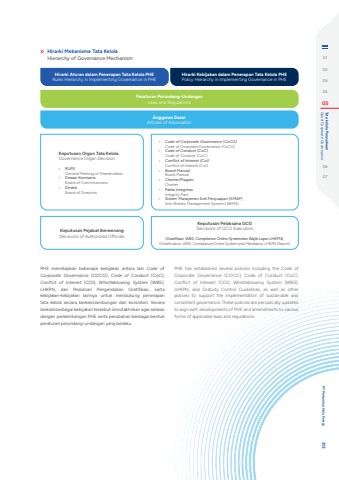 Hirarki Aturan dalam Penerapan Tata Kelola PHERules Hierarchy in Implementing Governance in PHEPeraturan Perundang-UndanganLaws and RegulationsAnggaran DasarArticles of AssociationKeputusan Organ Tata KelolaGovernance Organ Decision%u2022 RUPSGeneral Meeting of Shareholders%u2022 Dewan KomisarisBoard of Commissioners%u2022 DireksiBoard of DirectorsKeputusan Pejabat BerwenangDecisions of Authorized OfficialsKeputusan Pelaksana GCGDecisions of GCG Executors(Gratifikasi, WBS, Compliance Online Systemdan Wajib Lapor LHKPN),(Gratification, WBS, Compliance Online System and Mandatory LHKPN Report)%u2022 Code of Corporate Governance (CoCG)Code of Corporate Governance (CoCG)%u2022 Code of Conduct (CoC)Code of Conduct (CoC)%u2022 Conflict of Interest (CoI)Conflict of Interest (CoI)%u2022 Board ManualBoard Manual%u2022 Charter/PiagamCharter%u2022 Pakta IntegritasIntegrity Pact%u2022 Sistem Manajemen Anti Penyuapan (SMAP)Anti-Bribery Management System (ABMS)Hirarki Kebijakan dalam Penerapan Tata Kelola PHEPolicy Hierarchy in Implementing Governance in PHEHirarki Mekanisme Tata KelolaHierarchy of Governance MechanismPHE has established several policies including the Code of Corporate Governance (COCG), Code of Conduct (CoC), Conflict of Interest (COI), Whistleblowing System (WBS), LHKPN, and Gratuity Control Guidelines, as well as other policies to support the implementation of sustainable and consistent governance. These policies are periodically updated to align with developments of PHE and amendments to various forms of applicable laws and regulations.PHE menetapkan beberapa kebijakan antara lain Code of Corporate Governance (COCG), Code of Conduct (CoC), Conflict of Interest (COI), Whistleblowing System (WBS), LHKPN, dan Pedoman Pengendalian Gratifikasi, serta kebijakan-kebijakan lainnya untuk mendukung penerapan tata kelola secara berkesinambungan dan konsisten. Secara berkala berbagai kebijakan tersebut dimutakhirkan agar selaras dengan perkembangan PHE serta perubahan berbagai bentuk peraturan perundang-undangan yang berlaku.0102030405 Good Corporate Governance Tata kelola Perusahaan0607 PT Pertamina Hulu Energi 313