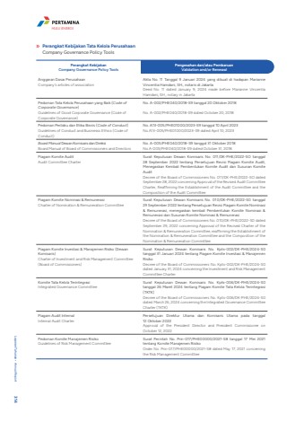 Perangkat Kebijakan Tata Kelola PerusahaanCompany Governance Policy ToolsPerangkat KebijakanCompany Governance Policy ToolsPengesahan dan/atau PembaruanValidation and/or RenewalAnggaran Dasar PerusahaanCompany's articles of associationAkta No. 11 Tanggal 9 Januari 2024 yang dibuat di hadapan Marianne Vincentia Hamdani, SH., notaris di JakartaDeed No. 11 dated January 9, 2024 made before Marianne Vincentia Hamdani, SH., notary in JakartaPedoman Tata Kelola Perusahaan yang Baik (Code of Corporate Governance)Guidelines of Good Corporate Governance (Code of Corporate Governance)No. A-002/PHE040/2018-S9 tanggal 20 Oktober 2018No. A-002/PHE040/2018-S9 dated October 20, 2018Pedoman Perilaku dan Etika Bisnis (Code of Conduct)Guidelines of Conduct and Businesss Ethics (Code of Conduct)No. A13-005/PHE01000/2023-S9 tanggal 10 April 2023No.A13-005/PHE01000/2023-S9 dated April 10, 2023Board Manual Dewan Komisaris dan DireksiBoard Manual of Board of Commissioners and DirectorsNo. A-005/PHE040/2018-S9 tanggal 31 Oktober 2018No.A-005/PHE040/2018-S9 dated October 31, 2018Piagam Komite AuditAudit Committee CharterSurat Keputusan Dewan Komisaris No. 011/DK-PHE/2022-SO tanggal 28 September 2022 tentang Persetujuan Revisi Piagam Komite Audit, Menegaskan Kembali Pembentukan Komite Audit dan Susunan Komite AuditDecree of the Board of Commissioners No. 011/DK-PHE/2022-SO dated September 28, 2022 concerning Approval of the Revised Audit Committee Charter, Reaffirming the Establishment of the Audit Committee and the Composition of the Audit CommitteePiagam Komite Nominasi & RemunerasiCharter of Nomination & Remuneration CommitteeSurat Keputusan Dewan Komisaris No. 010/DK-PHE/2022-S0 tanggal 29 September 2022 tentang Persetujuan Revisi Piagam Komite Nominasi & Remunerasi, menegaskan kembali Pembentukan Komite Nominasi & Remunerasi dan Susunan Komite Nominasi & RemunerasiDecree of the Board of Commissioners No. 010/DK-PHE/2022-S0 dated September 29, 2022 concerning Approval of the Revised Charter of the Nomination & Remuneration Committee, reaffirming the Establishment of the Nomination & Remuneration Committee and the Composition of the Nomination & Remuneration CommitteePiagam Komite Investasi & Manajemen Risiko (Dewan Komisaris)Charter of Investment and Risk Management Committee (Board of Commissioners)Surat Keputusan Dewan Komisaris No. Kpts-002/DK-PHE/2024-S0 tanggal 31 Januari 2024 tentang Piagam Komite Investasi & Manajemen RisikoDecree of the Board of Commissioners No. Kpts-002/DK-PHE/2024-S0 dated January 31, 2024 concerning the Investment and Risk Management Committee CharterKomite Tata Kelola TerintegrasiIntegrated Governance CommitteeSurat Keputusan Dewan Komisaris No. Kpts-006/DK-PHE/2024-S0 tanggal 26 Maret 2024 tentang Piagam Komite Tata Kelola Terintegrasi (TKTK)Decree of the Board of Commissioners No. Kpts-006/DK-PHE/2024-S0 dated March 26, 2024 concerning the Integrated Governance Committee Charter (TKTK)Piagam Audit InternalInternal Audit CharterPersetujuan Direktur Utama dan Komisaris Utama pada tanggal 12 Oktober 2022Approval of the President Director and President Commissioner on October 12, 2022Pedoman Komite Manajemen RisikoGuidelines of Risk Management CommitteeSurat Perintah No. Prin-017/PHE00000/2021-S8 tanggal 17 Mei 2021 tentang Komite Manajemen RisikoOrder No. Prin-017/PHE00000/2021-S8 dated May 17, 2021 concerning the Risk Management Committee Laporan Tahunan %u2022 Annual Report 314HULU ENERGI
