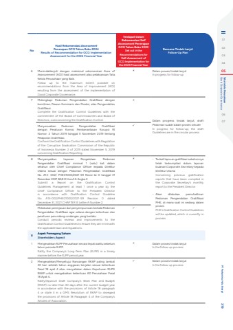 NoHasil Rekomendasi AssessmentPenerapan GCG Tahun Buku 2024 Results of Recommendation for GCG Implementation Assessment for the 2024 Financial Year Terdapat Dalam Rekomendasi Self Assessment Penerapan GCG Tahun Buku 2023Set out in the Recommendations for Self-Assessment of GCG Implementation for the 2023 Financial YearRencana Tindak LanjutFollow-Up Plan6 Menindaklanjuti dengan maksimal rekomendasi Area of Improvement (AOI) hasil assessment atas pelaksanaan Tata Kelola Perusahaan yang Baik.Follow up to the maximum extent possible on recommendations from the Area of Improvement (AOI) resulting from the assessment of the implementation of Good Corporate Governance.%uf0fb Dalam proses tindak lanjut In progress for follow-up7 Melengkapi Pedoman Pengendalian Gratifikasi dengan komitmen Dewan Komisaris dan Direksi, atas Pengendalian Gratifikasi.Complete the Gratification Control Guidelines with the commitment of the Board of Commissioners and Board of Directors, overconcerning the Gratification Control.%uf0fbDalam progress tindak lanjut, draft Pedoman sudah dalam proses sirkulerIn progress for follow-up; the draft Guidelines are in the circular processMenyesuaikan Pedoman Pengendalian Gratifikasi dengan Peraturan Komisi Pemberantasan Korupsi RI Nomor: 2 Tahun 2019 tanggal 5 November 2019 tentang Pelaporan Gratifikasi.Conform the Gratification Control Guidelines with Regulation of the Corruption Eradication Commission of the Republic of Indonesia Number: 2 of 2019 dated November 5, 2019 concerning Gratification Reporting.%uf0fc8 Menyampaikan Laporan Pengelolaan Pedoman Pengendalian Gratifikasi minimal 1 (satu) kali dalam setahun oleh Chief Compliance Officer kepada Direktur Utama sesuai dengan Pedoman Pengendalian Gratifikasi No. A13- 002/ PHE01000/2021-S9 Revisi ke 0 tanggal 31 Desember 2021 BAB III Huruf A Angka 2.Submitt a Report on the Gratification Control Guidelines Management at least 1 once a year by the Chief Compliance Officer to the President Director in accordance with Gratification Control Guideline No. A13-002/PHE01000/2021-S9 Revision 0 dated December 31, 2021 CHAPTER III Letter A Number 2.%uf0fb - Terkait laporan gratifikasi sebelumnya telah terkompilasi dalam laporan bulanan Corporate Secretary kepada Direktur UtamaConcerning previous gratification reports that have been compiled in the Corporate Secretary's monthly report to the President Director- Akan dilakukan pemutakhiran Pedoman Pengendalian Gratifikasi PHE, di mana saat ini sedang dalam prosesPHE's Gratification Control Guidelines will be updated, which is currently in processMelakukan peninjauan dan penyempurnaan berkala Pedoman Pengendalian Gratifikasi agar selaras dengan ketentuan dan peraturan perundang-undangan yang berlaku.Conduct periodic reviews and improvements to the Gratification Control Guidelines to ensure they are in line with the applicable laws and regulations.%uf0fcII Aspek Pemegang SahamShareholders Aspect1 Mengesahkan RJPP Perusahaan secara tepat waktu sebelum tahun periode RJPP.Ratify the Company%u2019s Long-Term Plan (RJPP) in a timely manner before the RJPP period year.%uf0fb Dalam proses tindak lanjut In the follow-up process 2 Mengesahkan/Menyetujui Rancangan RKAP paling lambat 30 hari setelah tahun anggaran berjalan sesuai ketentuan Pasal 18 ayat 4 atau menyatakan dalam Keputusan RUPS RKAP untuk mengabaikan ketentuan AD Perusahaan Pasal 18 Ayat 4.Ratify/Approve Draft Company%u2019s Work Plan and Budget (RKAP) no later than 30 days after the current budget year in accordance with the provisions of Article 18 paragraph 4 or state it in a GMS Resolution of RKAP to disregard the provisions of Article 18 Paragraph 4 of the Company%u2019s Articles of Association.%uf0fc Dalam proses tindak lanjut In the follow-up process 0102030405 Good Corporate Governance Tata kelola Perusahaan0607 PT Pertamina Hulu Energi 319