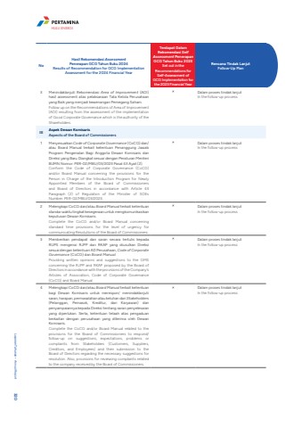 NoHasil Rekomendasi AssessmentPenerapan GCG Tahun Buku 2024 Results of Recommendation for GCG Implementation Assessment for the 2024 Financial Year Terdapat Dalam Rekomendasi Self Assessment Penerapan GCG Tahun Buku 2023Set out in the Recommendations for Self-Assessment of GCG Implementation for the 2023 Financial YearRencana Tindak LanjutFollow-Up Plan3 Menindaklanjuti Rekomendasi Area of Improvement (AOI) hasil assessment atas pelaksanaan Tata Kelola Perusahaan yang Baik yang menjadi kewenangan Pemegang Saham.Follow up on the Recommendations of Area of Improvement (AOI) resulting from the assessment of the implementation of Good Corporate Governance which is the authority of the Shareholders.%uf0fb Dalam proses tindak lanjut In the follow-up process III Aspek Dewan KomisarisAspects of the Board of Commissioners 1 Menyesuaikan Code of Corporate Governance (CoCG) dan/atau Board Manual terkait ketentuan Penanggung Jawab Program Pengenalan Bagi Anggota Dewan Komisaris dan Direksi yang Baru Diangkat sesuai dengan Peraturan Menteri BUMN Nomor: PER-02/MBU/03/2023 Pasal 43 Ayat (2).Conform the Code of Corporate Governance (CoCG) and/or Board Manual concerning the provisions for the Person in Charge of the Introduction Program for Newly Appointed Members of the Board of Commissioners and Board of Directors in accordance with Article 43 Paragraph (2) of Regulation of the Minister of SOEs Number: PER-02/MBU/03/2023.%uf0fb Dalam proses tindak lanjut In the follow-up process 2 Melengkapi CoCG dan/atau Board Manual terkait ketentuan standar waktu tingkat kesegeraan untuk mengkomunikasikan keputusan Dewan Komisaris.Complete the CoCG and/or Board Manual concerning standard time provisions for the level of urgency for communicating Resolutions of the Board of Commissioners.%uf0fb Dalam proses tindak lanjut In the follow-up process 3 Memberikan pendapat dan saran secara tertulis kepada RUPS mengenai RJPP dan RKAP yang diusulkan Direksi sesuai dengan ketentuan AD Perusahaan, Code of Corporate Governance (CoCG) dan Board Manual.Providing written opinions and suggestions to the GMS concerning the RJPP and RKAP proposed by the Board of Directors in accordance with the provisions of the Company%u2019s Articles of Association, Code of Corporate Governance (CoCG) and Board Manual.%uf0fb Dalam proses tindak lanjut In the follow-up process 4 Melengkapi CoCG dan/atau Board Manual terkait ketentuan bagi Dewan Komisaris untuk merespon/ menindaklanjuti saran, harapan, permasalahan atau keluhan dari Stakeholders(Pelanggan, Pemasok, Kreditur, dan Karyawan) dan penyampaiannya kepada Direksi tentang saran penyelesaian yang diperlukan. Serta, ketentuan telaah atas pengaduan berkaitan dengan perusahaan yang diterima oleh Dewan Komisaris.Complete the CoCG and/or Board Manual related to the provisions for the Board of Commissioners to respond/follow-up on suggestions, expectations, problems or complaints from Stakeholders (Customers, Suppliers, Creditors, and Employees) and their submission to the Board of Directors regarding the necessary suggestions for resolution. Also, provisions for reviewing complaints related to the company received by the Board of Commissioners.%uf0fb Dalam proses tindak lanjut In the follow-up process Laporan Tahunan %u2022 Annual Report 320HULU ENERGI