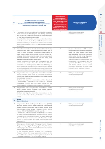 NoHasil Rekomendasi AssessmentPenerapan GCG Tahun Buku 2024 Results of Recommendation for GCG Implementation Assessment for the 2024 Financial Year Terdapat Dalam Rekomendasi Self Assessment Penerapan GCG Tahun Buku 2023Set out in the Recommendations for Self-Assessment of GCG Implementation for the 2023 Financial YearRencana Tindak LanjutFollow-Up Plan5 Memastikan Komite Nominasi dan Remunerasi melakukan telaah atas Usulan Penghargaan Atas Kinerja (Tantiem) dan Usulan Gaji Direksi dan Honorarium Dewan Komisaris PT PHE yang disampaikan oleh Direksi.Ensure that the Nomination and Remuneration Committee conducts a review of the Proposed Performance Awards (Tantiem) and Salary of the Directors and Honorarium of the Board of Commissioners of PT PHE submitted by the Board of Directors.%uf0fb Dalam proses tindak lanjut In the follow-up process6 Memastikan konsistensi format dan kepatuhan terhadap ketentuan yang diatur dalam Board Manual pada Bab III Huruf H Angka 5 tentang Penyusunan Risalah Rapat, di mana Risalah Rapat harus memuat informasi terkait halhal yang dibicarakan, dinamika rapat, termasuk pendapat berbeda (dissenting opinion) (bila ada) dan siapa yang mengemukakan pendapat di dalam rapat.Ensure consistency of format and compliance with the provisions set out in the Board Manual in Chapter III Letter H Number 5 on the Preparation of Minutes of Meeting, in which the Minutes of Meeting must state information related to matters discussed, meeting dynamics, including dissenting opinions (if any) and who expressed opinions at the meetings.%uf0fb Dewan Komisaris PHE telah melaksanakan sesuai dengan Anggaran Dasar PHE yang berlaku, dan tetap akan diupayakan lebih lanjut mengenai sistem atau format yang digunakan dalam penyusunan Risalah Rapat.The PHE Board of Commissioners has implemented it in accordance with the applicable PHE Articles of Association, and further efforts will be made concerning the system or format used in preparing the Minutes of Meeting.7 Menyesuaikan dan menyelaraskan nomenklatur Komite Dewan Komisaris dalam Code of Corporate Governance(CoCG) agar selaras dengan perubahan nomenklatur terbaru Komite Dewan Komisaris.Conform and align the nomenclature of the Board of Commissioners Committee in the Code of Corporate Governance (CoCG) with the latest change of the nomenclature of the Board of Commissioners Committee.%uf0fb Dalam proses tindak lanjut In the follow-up process8 Menyesuaikan dan menyelaraskan nomenklatur komite dalam Piagam Komite Investasi agar selaras dengan perubahan nomenklatur terbaru.Conform and align the committee nomenclature in the Investment Committee Charter with the latest nomenclature change.%uf0fc Dalam proses tindak lanjut In the follow-up processIV DireksiBoard of Directors1 Menyesuaikan Code of Corporate Governance (CoCG) dan/atau Board Manual terkait ketentuan Penanggung Jawab Program Pengenalan bagi anggota Direksi yang Baru Diangkat sesuai dengan Peraturan Menteri BUMN Nomor: PER-2/MBU/03/2023 Pasal 43 Ayat (2). Conform the Code of Corporate Governance (CoCG) and/or Board Manual concerning the provisions for the Person in Charge of the Introduction Program for Newly Appointed Board of Directors in accordance with Regulation of the Minister of SOEs Number: PER-2/MBU/03/2023 Article 43 Paragraph (2).%uf0fb Dalam proses tindak lanjut In the follow-up processDalam proses tindak lanjut Melengkapi materi Program Pengenalan bagi anggota Direksi yang baru diangkat dengan materi yang di atur dalam Code of Corporate Governance(CoCG) dan Board Manual.In the follow-up process, complete the Introduction Program material for newly appointed members of the Board of Directors with the material regulated in the Code of Corporate Governance (CoCG) and Board Manual.%uf0fb Dalam proses tindak lanjut In the follow-up process0102030405 Good Corporate Governance Tata kelola Perusahaan0607 PT Pertamina Hulu Energi 321