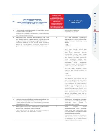 NoHasil Rekomendasi AssessmentPenerapan GCG Tahun Buku 2024 Results of Recommendation for GCG Implementation Assessment for the 2024 Financial Year Terdapat Dalam Rekomendasi Self Assessment Penerapan GCG Tahun Buku 2023Set out in the Recommendations for Self-Assessment of GCG Implementation for the 2023 Financial YearRencana Tindak LanjutFollow-Up Plan8 Memperhatikan tingkat pencapaian KPI Subholding dengan yang ditargetkan dalam RKAP.Pay attention to the level of achievement of Subholding KPIs with those targeted in the RKAP.%uf0fb Dalam proses tindak lanjut In the follow-up process9 Memastikan tidak terdapat temuan-temuan audit, baik oleh auditor eksternal maupun auditor internal mengenai pengadaan barang dan jasa yang merugikan Perusahaan.Ensure that there are no audit findings, either by external auditors or internal auditors, concerning procurement of goods and services that are detrimental to the Company.%uf0fc SCM telah melakukan upaya-upaya dalam preventive action terkait temuan audit, termasuk diantaranya yang terbaru:- Ucan- GEPSmartSCM tidak memilki kontrol atas kekosongan temuan, namun SCM dapat melakukan aksi-aksi meminimalisir temuan. Dan hingga saat ini, tidak terdapat temuan major atau kategori merugikan perusahaan terkait pengadaan barang jasa. Serta, meningkatkan komitmen dan memastikan dalam pengelolaan pengadaan barang dan jasa tidak ada praktik yang merugikan Perusahaan.SCM has taken preventive actions related to audit findings, including the most recent:- Ucan- GEPSmartSCM does not have control over the gaps in findings, but it can take actions to minimize findings. Up until now, there have been no major findings or categories that are detrimental to the company related to the procurement of goods and services. In addition, SCM shows more commitment and ensure that in the management of goods and services procurement there are no practices that are detrimental to the Company.10 Menyusun kebijakan pengaturan untuk anak perusahaan dan perusahaan patungan (subsidiary governance).Develop regulatory policies for subsidiaries and joint ventures (subsidiary governance).%uf0fb Diagendakan pembaharuan kebijakan dengan berkoordinasi dengan HoldingScheduled policy updates in coordination with Holding11 Meningkatkan upaya untuk menindaklanjuti rekomendasi/temuan Audit Internal dan Auditor Eksternal.Make more efforts to follow up on recommendations/findings of Internal Audit and External Auditors.%uf0fb Dalam progres secara berkesinambungan untuk melakukan tindak lanjut dari rekomendasi AOI hasil assessment atas pelaksanaan Tata Kelola Perusahaan yang baikIn continuous progress to follow up on AOI recommendations resulting from the assessment of the implementation of good Corporate Governance0102030405 Good Corporate Governance Tata kelola Perusahaan0607 PT Pertamina Hulu Energi 323