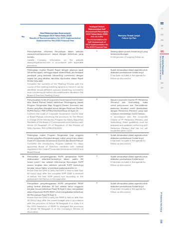 NoHasil Rekomendasi AssessmentPenerapan GCG Tahun Buku 2024 Results of Recommendation for GCG Implementation Assessment for the 2024 Financial Year Terdapat Dalam Rekomendasi Self Assessment Penerapan GCG Tahun Buku 2023Set out in the Recommendations for Self-Assessment of GCG Implementation for the 2023 Financial YearRencana Tindak LanjutFollow-Up PlanMemutakhirkan informasi Perusahaan dalam website www.phe.pertamina.com sesuai dengan ketentuan yang berlaku. Update Company information on the website www.phe.pertamina.com in accordance with applicable provisions.%uf0fb Sedang dalam proses tindak lanjut yang berkesinambunganIn the process of ongoing follow-upMelengkapi muatan Risalah Rapat dengan jalannya rapat (dinamika rapat), sehingga dapat diidentifikasi jika terdapat pendapat yang berbeda (dissenting comments) dengan segala hal yang dibahas dan/atau diputuskan dalam Rapat Direksi (bila ada). Complete the contents of the Meeting Minutes with the course of the meeting (meeting dynamics), hence it can be identified should different opinions (dissenting comments) arise concerning all matters discussed and/or decided in the Board of Directors Meeting (if any).%uf0fb Sudah dimasukkan dalam agenda untuk dilakukan pembahasan tindak lanjutIt has been included in the agenda for follow-up discussionsMenyesuaikan Code of Corporate Governance (CoCG) dan/atau Board Manual terkait ketentuan Penanggung Jawab Program Pengenalan Bagi Anggota Dewan Komisaris dan Direksi yang Baru Diangkat sesuai dengan Peraturan Menteri BUMN Nomor: PER-2/MBU/03/2023 Pasal 43 Ayat (2). Conform the Code of Corporate Governance (CoCG) and/or Board Manual concerning the provisions for the Person in Charge of the Introduction Program for Newly Appointed Members of the Board of Commissioners and Directors with Article 43 Paragraph (2) of Regulation of the Minister of SOEs Number: PER-2/MBU/03/2023.%uf0fb Sesuai Corporate Charter PT Pertamina (Persero) dan Subholding, maka untuk penyusunan dan Pemutakhiran pedoman tersebut mesti diselaraskan dengan Pertamina (Persero) yang saat ini belum menerbitkan CoCG terbaru.In accordance with the Corporate Charter of PT Pertamina (Persero) and Subholding, these guidelines must be prepared and updated conforming with Pertamina (Persero) that has not yet issued the latest CoCG.Melengkapi materi Program Pengenalan bagi anggota Direksi yang Baru Diangkat dengan materi yang di atur dalam Code of Corporate Governance (CoCG) dan Board Manual.Complete the Introductory Program material for newly appointed Board of Directors members with material regulated in the Code of Corporate Governance (CoCG) and Board Manual.%uf0fb Sudah dimasukkan dalam agenda untuk dilakukan pembahasan tindak lanjutIt has been included in the agenda for follow-up discussions18 Memastikan penyelenggaraan RUPS pengesahan RJPP dilaksanakan selambat-lambatnya dalam waktu 60 (enam puluh) hari setelah diterimanya Rancangan RJPP secara lengkap atau sebelum periode RJPP berikutnya berjalan sesuai faktor uji penilaian pada parameter ini. Ensure that the GMS to ratify the RJPP is held no later than 60 (sixty) days after the complete RJPP Draft is received or before the next RJPP period runs according to the assessment test factors in this parameter.%uf0fb Sudah dimasukkan dalam agenda untuk dilakukan pembahasan tindak lanjutIt has been included in the agenda for follow-up discussionsMemastikan penyelenggaraan RUPS pengesahan RKAP paling lambat dilakukan 30 hari setelah tahun anggaran berjalan sesuai ketentuan Pasal 18 Ayat 4 atau menyatakan dalam Keputusan RUPS RKAP untuk mengabaikan ketentuan AD Perusahaan Pasal 18 Ayat 4.Ensure that the GMS to ratify the RKAP is held no later than 30 (thirty) days after the current budget year in accordance with the provisions of Article 18 Paragraph 4 or state it in the GMS Resolution of RKAP to disregard the provisions of Article 18 Paragraph 4 of the Company%u2019s Articles of Association.%uf0fb Sudah dimasukkan dalam agenda untuk dilakukan pembahasan tindak lanjutIt has been included in the agenda for follow-up discussions0102030405 Good Corporate Governance Tata kelola Perusahaan0607 PT Pertamina Hulu Energi 325
