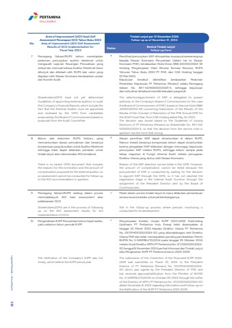 No.Area of Improvement (AOI) Hasil Self Assessment Penerapan GCG Tahun Buku 2023Area of Improvement (AOI) Self Assessment Results of GCG Implementation for Fiscal Year 2023Tindak Lanjut per 31 Desember 2024Follow-up as of December 31, 2024Status Bentuk Tindak LanjutFollow-up Form7 Pemegang Saham/RUPS belum menetapkan pedoman penunjukan auditor eksternal untuk mengaudit Laporan Keuangan Perusahaan yang antara lain memuat bahwa Auditor Eksternal harus ditunjuk dan ditelaah oleh RUPS dari calon yang diajukan oleh Dewan Komisaris berdasarkan usulan dari Komite Audit. Shareholders/GMS have not yet determined Guidelines of appointing external auditors to audit the Company's Financial Reports, which include the fact that the External Auditor must be appointed and reviewed by the GMS from candidates proposed by the Board of Commissioners based on proposals from the Audit Committee.%uf0fb Pemilihan/penunjukan KAP dilimpahkan kuasanya/wewenangnya kepada Dewan Komisaris Perusahaan (dalam hal ini Dewan Komisaris PHE), berdasarkan Nota Dinas 088/J00000/2024-S9 tentang Penyampaian Hasil Review Konsep Resolusi RUPS Tahunan Tahun Buku 2023 PT PHE, dari CAE Holding tanggal 22 Mei 2024. Keputusan tersebut diterbitkan berdasarkan Pedoman Penerbitan Keputusan PT Pertamina (Persero) selaku Pemegang Saham No. A9.1-02/N00000/2023-S, sehingga keputusan dari nota dinas dimaksud memiliki kekuatan yang kuat. The selection/appointment of KAP is delegated its power/authority to the Company's Board of Commissioners (in this case the Board of Commissioners of PHE), based on Service Note 088/J00000/2024-S9 concerning Submission of the Results of the Review of the Concept of Resolution of the PHE Annual GMS for the 2023 Fiscal Year, from CAE Holding dated May 22, 2024.The decision was issued based on the Guidelines of Issuing Decisions of PT Pertamina (Persero) as Shareholder No. A9.1-02/N00000/2023-S, so that the decision from the service note in question has the force that strong. 8 Belum ada dokumen RUPS terbaru yang mencantumkan alasan pencalonan dan besarnya kompensasi yang diusulkan untuk Auditor Eksternal sehingga tidak dapat dilakukan penilaian untuk tindak lanjut atas rekomendasi AOI dimaksud.There is no recent GMS document that includes the reasons for the nomination and the amount of compensation proposed for the external auditor, so an assessment cannot be conducted for follow-up to the AOI recommendation in question.%uf0fb Alasan pemilihan KAP dapat dicantumkan di dalam RUPS. Namun terkait besarnya kompensasi belum dapat dicantumkan karena pengadaan KAP dilakukan dengan menunggu keputusan penunjukan KAP melalui RUPS, sehingga belum sampai pada tahap negosiasi di Fungsi Internal Audit melalui penugasan Direktur Utama yang diutus oleh Dewan Komisaris. Reason of the KAP selection can be listed in the GMS. However, the amount of compensation cannot be listed because the procurement of KAP is conducted by waiting for the decision to appoint KAP through the GMS, so it has not reached the negotiation stage in the Internal Audit Function through the assignment of the President Director sent by the Board of Commissioners.9 Pemegang Saham/RUPS sedang dalam proses menindaklanjuti AOI hasil assessment atas pelaksanaan GCG. Shareholders/GMS are in the process of following up on the AOI assessment results for the implementation of GCG.%uf0fc Masih dalam proses tindak lanjut di mana dilakukan pemantauan secara secara berkala untuk perkembangannya.Still in the follow-up process where periodic monitoring is conducted for its development.10 Pengesahaan RJPP Perusahaan belum tepat waktu, yaitu sebelum tahun periode RJPP.The ratification of the Company's RJPP was not timely, which before the RJPP period year.%uf0fc Penyampaian Koreksi Usulan RJPP 2025-2029 Subholding Upstream PT Pertamina Hulu Energi telah disampaikan di tanggal 22 Maret 2024 kepada Direktur Utama PT Pertamina No. 057/PH00000/2024-SO yang ditandatangani oleh Direktur Utama PHE dan telah mendapatkan persetujuan/disahkan Mentri BUMN No S-549MBU/10/2024 pada tanggal 29 Oktober 2024 melalui Surat Direktur SPPU PT Pertamina No. 311/G00000/2024-SO tanggal 8 November 2024 perihal Informasi dan Tindak Lanjut atas Pengesahan RJPP PT Pertamina tahun 2025-2029.The submission of the Correction of the Proposed RJPP 2025-2029 was submitted on March 22, 2024 to the President Director of PT Pertamina (Persero) No. 057/PH00000/2024-SO which was signed by the President Director of PHE and has received approval/ratification from the Minister of BUMN No. S-549MBU/10/2024 on October 29, 2024 through the Letter of the Director of SPPU PT Pertamina No. 311/G00000/2024-SO dated November 8, 2024 regarding Information and Follow-up on the Ratification of the RJPP PT Pertamina 2025-2029.Laporan Tahunan %u2022 Annual Report 332HULU ENERGI