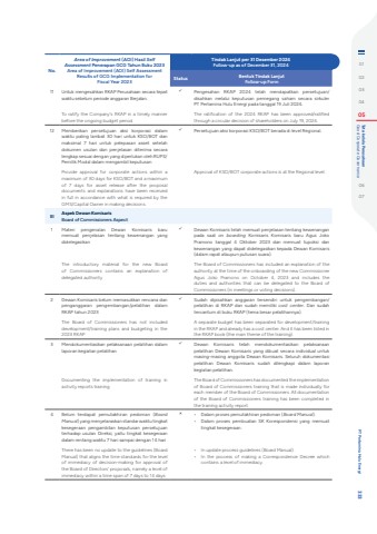 No.Area of Improvement (AOI) Hasil Self Assessment Penerapan GCG Tahun Buku 2023Area of Improvement (AOI) Self Assessment Results of GCG Implementation for Fiscal Year 2023Tindak Lanjut per 31 Desember 2024Follow-up as of December 31, 2024Status Bentuk Tindak LanjutFollow-up Form11 Untuk mengesahkan RKAP Perusahaan secara tepat waktu sebelum periode anggaran Berjalan.To ratify the Company's RKAP in a timely manner before the ongoing budget period.%uf0fc Pengesahan RKAP 2024 telah mendapatkan persetujuan/disahkan melalui keputusan pemegang saham secara sirkuler PT Pertamina Hulu Energi pada tanggal 19 Juli 2024. The ratification of the 2024 RKAP has been approved/ratified through a circular decision of shareholders on July 19, 2024.12 Memberikan persetujuan aksi korporasi dalam waktu paling lambat 30 hari untuk KSO/BOT dan maksimal 7 hari untuk pelepasan asset setelah dokumen usulan dan penjelasan diterima secara lengkap sesuai dengan yang diperlukan oleh RUPS/Pemilik Modal dalam mengambil keputusanProvide approval for corporate actions within a maximum of 30 days for KSO/BOT and a maximum of 7 days for asset release after the proposal documents and explanations have been received in full in accordance with what is required by the GMS/Capital Owner in making decisions.%uf0fc Persetujuan aksi korporasi KSO/BOT berada di level Regional.Approval of KSO/BOT corporate actions is at the Regional level.III Aspek Dewan KomisarisBoard of Commissioners Aspect1 Materi pengenalan Dewan Komisaris baru memuat penjelasan tentang kewenangan yang didelegasikanThe introductory material for the new Board of Commissioners contains an explanation of delegated authority%uf0fc Dewan Komisaris telah memuat penjelasan tentang kewenangan pada saat on boarding Komisaris Komisaris baru Agus Joko Pramono tanggal 4 Oktober 2023 dan memuat tupoksi dan kewenangan yang dapat didelegasikan kepada Dewan Komisaris (dalam rapat ataupun putusan suara). The Board of Commissioners has included an explanation of the authority at the time of the onboarding of the new Commissioner Agus Joko Pramono on October 4, 2023 and includes the duties and authorities that can be delegated to the Board of Commissioners (in meetings or voting decisions).2 Dewan Komisaris belum memasukkan rencana dan penganggaran pengembangan/pelatihan dalam RKAP tahun 2023The Board of Commissioners has not included development/training plans and budgeting in the 2023 RKAP%uf0fc Sudah dipisahkan anggaran tersendiri untuk pengembangan/pelatihan di RKAP dan sudah memiliki cost center. Dan sudah tercantum di buku RKAP (tema besar pelatihannya). A separate budget has been separated for development/training in the RKAP and already has a cost center. And it has been listed in the RKAP book (the main theme of the training).3 Mendokumentasikan pelaksanaan pelatihan dalam laporan kegiatan pelatihan Documenting the implementation of training in activity reports training%uf0fc Dewan Komisaris telah mendokumentasikan pelaksanaan pelatihan Dewan Komisaris yang dibuat secara individual untuk masing-masing anggota Dewan Komisaris. Seluruh dokumentasi pelatihan Dewan Komisaris sudah dilengkapi dalam laporan kegiatan pelatihan. The Board of Commissioners has documented the implementation of Board of Commissioners training that is made individually for each member of the Board of Commissioners. All documentation of the Board of Commissioners training has been completed in the training activity report.4 Belum terdapat pemutakhiran pedoman (Board Manual) yang menyelaraskan standar waktu tingkat kesegeraan pengambilan keputusan persetujuan terhadap usulan Direksi, yaitu tingkat kesegeraan dalam rentang waktu 7 hari sampai dengan 14 hariThere has been no update to the guidelines (Board Manual) that aligns the time standards for the level of immediacy of decision-making for approval of the Board of Directors' proposals, namely a level of immediacy within a time span of 7 days to 14 days%uf0fb %u2022 Dalam proses pemutakhiran pedoman (Board Manual).%u2022 Dalam proses pembuatan SK Korespondensi yang memuat tingkat kesegeraan. %u2022 In update process guidelines (Board Manual).%u2022 In the process of making a Correspondence Decree which contains a level of immediacy.0102030405 Good Corporate Governance Tata kelola Perusahaan0607 PT Pertamina Hulu Energi 333