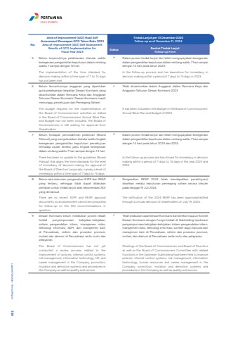 No.Area of Improvement (AOI) Hasil Self Assessment Penerapan GCG Tahun Buku 2023Area of Improvement (AOI) Self Assessment Results of GCG Implementation for Fiscal Year 2023Tindak Lanjut per 31 Desember 2024Follow-up as of December 31, 2024Status Bentuk Tindak LanjutFollow-up Form5 Belum terpenuhinya pelaksanaan standar waktu kesegeraan pengambilan keputusan dalam rentang waktu 7 sampai dengan 14 hari.The implementation of the time standard for decision-making within a time span of 7 to 14 days has not been met.%uf0fb Dalam proses tindak lanjut dan telah mengupayakan kesegeraan dalam pengambilan keputusan dalam rentang waktu 7 hari sampai dengan 14 hari pada tahun 2023. In the follow-up process and has beenstrive for immediacy in decision making within a period of 7 days to 14 days in 2023. 6 Belum tercantumnya anggaran yang diperlukan guna pelaksanaan kegiatan Dewan Komisaris yang dicantumkan dalam Rencana Kerja dan Anggaran Tahunan Dewan Komisaris. Dewan Komisaris masih menunggu persetujuan dari Pemegang Saham.The budget required for the implementation of the Board of Commissioners' activities as stated in the Board of Commissioners' Annual Work Plan and Budget has not been included. The Board of Commissioners is still waiting for approval from Shareholders.%uf0fc Telah dicantumkan dalam Anggaran dalam Rencana Kerja dan Anggaran Tahunan Dewan Komisaris 2023. It has been included in the Budget in the Board of Commissioners' Annual Work Plan and Budget of 2023. 7 Belum terdapat pemutakhiran pedoman (Board Manual) yang menyelaraskan standar waktu tingkat kesegeraan pengambilan keputusan persetujuan terhadap usulan Direksi, yaitu tingkat kesegeraan dalam rentang waktu 7 hari sampai dengan 14 hari.There has been no update to the guidelines (Board Manual) that aligns the time standards for the level of immediacy of decision-making for approval of the Board of Directors' proposals, namely a level of immediacy within a time span of 7 days to 14 days.%uf0fb Dalam proses tindak lanjut dan telah mengupayakan kesegeraan dalam pengambilan keputusan dalam rentang waktu 7 hari sampai dengan 14 hari pada tahun 2023 dan 2024.In the follow-up process and has strived for immediacy in decision making within a period of 7 days to 14 days in the year 2023 and 2024.8 Belum ada dokumen pengesahan RJPP dan RKAP yang terbaru, sehingga tidak dapat dilakukan penilaian untuk tindak lanjut atas rekomendasi AOI yang dimaksud.There are no recent RJPP and RKAP approval documents, so an assessment cannot be conducted for follow-up on the AOI recommendations in question.%uf0fc Pengesahan RKAP 2024 telah mendapatkan persetujuan/disahkan melalui keputusan pemegang saham secara sirkuler pada tanggal 19 Juli 2024. The ratification of the 2024 RKAP has been approved/ratified through a circular decision of shareholders on July 19, 2024.9 Dewan Komisaris belum melakukan proses telaah terkait penyempurnaan kebijakan-kebijakan, sistem pengendalian intern, manajemen risiko, teknologi informasi, SDM, dan manajemen karir di Perusahaan, sistem dan prosedur promosi, mutasi dan demosi di Perusahaan serta mutu dan pelayanan.The Board of Commissioners has not yet conducted a review process related to the improvement of policies, internal control systems, risk management, information technology, HR, and career management in the Company, promotion, mutation and demotion systems and procedures in the Company as well as quality and service.%uf0fc Telah dilakukan rapat Dewan Komisaris dan Direksi maupun Komite Dewan Komisaris dengan Fungsi terkait di Subholding Upstreampenyempurnaan kebijakan-kebijakan: sistem pengendalian intern, manajemen risiko, teknologi informasi, sumber daya manusia dan manajemen karir di Perusahaan, sistem dan prosedur promosi, mutasi, dan demosi di Perusahaan serta mutu dan pelayanan. Meetings of the Board of Commissioners and Board of Directors as well as the Board of Commissioners Committee with related Functions in the Upstream Subholding have been held to improve policies: internal control systems, risk management, information technology, human resources and career management in the Company, promotion, mutation and demotion systems and procedures in the Company as well as quality and service. Laporan Tahunan %u2022 Annual Report 334HULU ENERGI