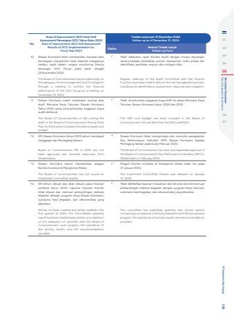 No.Area of Improvement (AOI) Hasil Self Assessment Penerapan GCG Tahun Buku 2023Area of Improvement (AOI) Self Assessment Results of GCG Implementation for Fiscal Year 2023Tindak Lanjut per 31 Desember 2024Follow-up as of December 31, 2024Status Bentuk Tindak LanjutFollow-up Form10 Dewan Komisaris telah memberikan masukan atas kecukupan manajemen risiko beserta mitigasinya melalui rapat dalam rangka monitoring kinerja keuangan SHU Group pada rapat tanggal 23 November 2023.The Board of Commissioners has provided input on the adequacy of risk management and its mitigation through a meeting to monitor the financial performance of the SHU Group at a meeting on November 23, 2023.%uf0fc Telah dilakukan rapat Komite Audit dengan Fungsi Keuangan secara berkala membahas proses manajemen risiko antara lain identifikasi, penilaian, respon, dan mitigasi risiko. Regular meetings of the Audit Committee with the Finance Function have been held to discuss the risk management process, including risk identification, assessment, response and mitigation.11 Dewan Komisaris masih melakukan routing atas draft Rencana Kerja Tahunan Dewan Komisaris Tahun 2024 yang mencantumkan anggaran biaya audit eksternal.The Board of Commissioners is still routing the draft of the Board of Commissioners' Annual Work Plan for 2024 which includes the external audit cost budget.%uf0fc Telah dicantumkan anggaran biaya KAP ke dalam Rencana Kerja Tahunan Dewan Komisaris tahun 2024 dan 2025. The KAP cost budget has been included in the Board of Commissioners' Annual Work Plan for 2024 and 2025.12 KPI Dewan Komisaris tahun 2023 belum mendapat tanggapan dari Pemegang Saham.Board of Commissioners KPI in 2023 has not been approved and received responses from Shareholders. %uf0fb Dewan Komisaris telah mengirimkan dan meminta pengesahan Key Performance Indicator (KPI) Dewan Komisaris kepada Pemegang Saham pada bulan Februari 2023. The Board of Commissioners has sent and requested approval of the Board of Commissioners' Key Performance Indicators (KPI) to Shareholders in February 2023.13 Dewan Komisaris belum menerbitkan piagam Komite Investasi & Manajemen Risiko.The Board of Commissioners has not issued an Investment Committee charter.%uf0fc Piagam Komite Investasi & Manajemen Risiko telah rilis pada 31 Januari 2024. The Investment Committee Charter was released on January 31, 2024.14 AR belum dibuat dan akan dibuat pada triwulan pertama tahun 2024. Laporan triwulan Komite telah dibuat dan memuat perbandingan realisasi kegiatan dengan program kerja Dewan Komisaris, substansi hasil kegiatan, dan rekomendasi yang diberikan.AR has not been created and will be created in the first quarter of 2024. The Committee's quarterly report has been created and contains a comparison of the realization of activities with the Board of Commissioners' work program, the substance of the activity results, and the recommendations provided.%uf0fc Telah diterbitkan laporan triwulanan dan tahunan komite memuat perbandingan realisasi kegiatan dengan program kerja tahunan, substansi hasil kegiatan, dan rekomendasi yang diberikan. The committee has published quarterly and annual reports containing a comparison of activity realization with the annual work program, the substance of activity results, and recommendations provided.0102030405 Good Corporate Governance Tata kelola Perusahaan0607 PT Pertamina Hulu Energi 335
