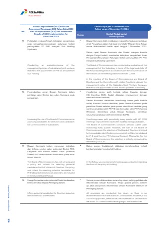 No.Area of Improvement (AOI) Hasil Self Assessment Penerapan GCG Tahun Buku 2023Area of Improvement (AOI) Self Assessment Results of GCG Implementation for Fiscal Year 2023Tindak Lanjut per 31 Desember 2024Follow-up as of December 31, 2024Status Bentuk Tindak LanjutFollow-up Form15 Melakukan evaluasi/telaah kebijakan pengelolaan anak perusahaan/perusahaan patungan terkait penunjukkan PT PHE menjadi Sub Holding Upstream. Conducting an evaluation/review of the management policies of subsidiaries/joint ventures related to the appointment of PHE as an Upstream Sub Holding.%uf0fc Dewan Komisaris telah melakukan evaluasi terhadap pengelolaan Anak Perusahaan dalam hal legal end-state Wilayah Kerja Rokan sesuai dokumentasi risalah rapat tanggal 1 November 2023.Dalam rapat Dewan Komisaris dan Direksi maupun Komite dengan Fungsi terkait, membahas kebijakan pengelolaan Anak Perusahaan/Perusahaan Patungan terkait penunjukkan PT PHE menjadi Subholding Upstream.The Board of Commissioners has conducted an evaluation of the management of the Subsidiary in terms of the legal end-state of the Rokan Working Area in accordance with the documentation of the minutes of the meeting dated November 1, 2023.In the meeting of the Board of Commissioners and Board of Directors and the Committee with related Functions, discuss the management policy of the Subsidiary/Joint Venture Company related to the appointment of PHE as the Upstream Subholding.16 Meningkatkan peran Dewan Komisaris dalam penilaian calon Direksi dan calon Komisaris anak perusahaan. Increasing the role of the Board of Commissioners in assessing candidates for Directors and candidates for Commissioners of subsidiaries.%uf0fc Monitoring career path berkala setiap triwulan dengan HC (meeting KNR). Sudah dilakukan improvement dengan mencantumkan kandidat. Dewan Komisaris melakukan monitoring career path berkala setiap triwulan. Namun demikian, peran Dewan Komisaris pada pemilihan Direksi sebatas pada proses identifikasi kandidat yang nantinya divalidasi oleh PT PHE dan kemudian oleh PT Pertamina (Persero). Sementara untuk Dewan Komisaris, pemilihan seluruhnya dilakukan oleh kementerian BUMN.Monitoring career path periodically every quarter with HC (KNR meeting). Improvements have been made by listing candidates.The Board of Commissioners conducts periodic career path monitoring every quarter. However, the role of the Board of Commissioners in the selection of the Board of Directors is limited to the candidate identification process which will later be validated by PHE and then by PT Pertamina (Persero). Meanwhile, for the Board of Commissioners, the selection is entirely conducted by the Ministry of SOEs.17 Dewan Komisaris belum menyusun kebijakan dan kriteria seleksi calon potensial Direksi PHE. Kebijakan dan kriteria seleksi calon potensial Direksi PHE direncanakan dimasukkan pada revisi Board Manual.The Board of Commissioners has not yet prepared a policy and criteria for selecting potential candidates for PHE's Board of Directors. The policy and criteria for selecting potential candidates for PHE's Board of Directors are planned to be included in the revised Board Manual.%uf0fb Dalam proses tindaklanjut, dilakukan benchmarking terkait bentuk kebijakan tersebut di Holding. In the follow-up process, benchmarking was conducted regarding the form of the policy at Holding.18 Menginformasikan calon potensial Direksi berdasarkan kriteria tersebut kepada Pemegang Saham.Inform potential candidates for Directors based on these criteria to Shareholders.%uf0fc Semua proses dilaksanakan secara top down, sehingga tidak ada rekomendasi Dewan Komisaris. Tetapi apabila proses bottom up, akan ada proses rekomendasi Dewan Komisaris sebelum ke Pemegang Saham. All processes are conducted top down, so there is no recommendation from the Board of Commissioners. However, if it is a bottom up process, there will be a recommendation process from the Board of Commissioners before going to the Shareholders. Laporan Tahunan %u2022 Annual Report 336HULU ENERGI