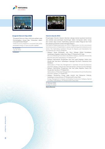 Subroto Awards 2024Penghargaan Subroto Awards diberikan sebagai bentuk apresiasi komitmen dan prestasi para pemangku kepentingan dalam memajukan sektor energi dan sumber daya mineral. Subholding Upstream melalui Regional dan Anak Perusahaannya berhasil meraih berbagai kategori: The Subroto Awards were given as a form of appreciation for the commitment and achievements of stakeholders in advancing the energy and mineral resources sector. The Subholding Upstream through its Regions and Subsidiaries has successfully won various categories:%u2022 Kategori Tanpa Kehilangan Jam Kerja Sebagai Akibat Kecelakaan, Subkategori Kegiatan Usaha Hulu Migas: PT Pertamina EP Cepu No Loss of Working Hours Due to Accidents Category, Upstream Oil and Gas Business Activities Subcategory: PT Pertamina EP %u2022 Kategori Optimalisasi Pengelolaan Gas Suar pada Kegiatan Usaha Hulu Minyak dan Gas Bumi, Subkategori Lapangan Gas Bumi: Pertamina Hulu Mahakam Optimization of Flare Gas Management in Upstream Oil and Gas Business Activities Category, Natural Gas Field Subcategory: Pertamina Hulu Mahakam %u2022 Kategori Optimalisasi Pengelolaan Gas Suar pada Kegiatan Usaha Hilir Minyak dan Gas Bumi: PT Badak NGL Optimization of Flare Gas Management in Downstream Oil and Gas Business Activities Category: PT Badak NGL%u2022 Kategori Manajemen Energi pada Industri dan Bangunan Gedung, Subkategori Inovasi Khusus: PT Pertamina EP Limau FieldEnergy Management in Industry and Building Construction Category, Special Innovation Subcategory: PT Pertamina EP Limau Field10 Oktober 2024October 10, 2024Warta EkonomiAnugerah Ekonomi Hijau 2024%u201cAnugerah Ekonomi Hijau untuk perusahaan yang Memanfaatkan Energi Baru Terbarukan dalam menyejahterakan Rakyat%u201d%u201cGreen Economy Award for companies that utilize renewable energy to improve public welfare%u201d30 Juli 2024July 30, 2024DetikcomLaporan Tahunan %u2022 Annual Report 32PT Pertamina Hulu Energi 33HULU ENERGI