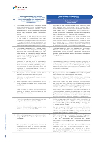 No.Area of Improvement (AOI) Hasil Self Assessment Penerapan GCG Tahun Buku 2023Area of Improvement (AOI) Self Assessment Results of GCG Implementation for Fiscal Year 2023Tindak Lanjut per 31 Desember 2024Follow-up as of December 31, 2024Status Bentuk Tindak LanjutFollow-up Form3 Penyampaian rancangan RJPP 2022-2026 kepada Dewan Komisaris telah selesai tepat waktu sesuai timeline dari PT Pertamina (Persero), namun pengesahan RJPP secara consolidated Pertamina ditunda dari Pemegang Saham (Kementerian BUMN).The submission of the draft RJPP 2022-2026 to the Board of Commissioners has been completed on time according to the timeline from PT Pertamina (Persero), but the ratification of the RJPP in Pertamina's consolidated manner has been postponed by the Shareholders (Ministry of SOEs).%uf0fc SHU saat ini telah mengacu kepada RJPP 2025-2029 yang telah disahkan oleh Kementerian BUMN Menteri BUMN No. S-549/MBU/10/2024 pada tanggal 29 Oktober 2024 melalui Surat Direktur SPPU PT Pertamina No. 311/G00000/2024-S0 tanggal 8 November 2024 perihal Informasi dan Tindak Lanjut atas Pengesahan RJPP PT Pertamina Tahun 2025-2029. The current SHU has referred to the 2025-2029 RJPP which has been ratified by the Ministry of SOEs Minister of SOEs No. S-549/MBU/10/2024 on October 29, 2024 through the Letter of the Director of SPPU PT Pertamina No. 311/G00000/2024-S0 dated November 8, 2024 concerning Information and Follow-up on the Ratification of the 2025-2029 RJPP PT Pertamina.4 Penyampaian rancangan RKAP kepada Dewan Komisaris belum sesuai dengan batas waktu yang ditetapkan oleh panduan SK-16/MBU/2012 yaitu pada tanggal 30 September sebelum periode berjalan serta penyampaian kepada Pemegang Saham sebelum tanggal 31 Oktober sebelum periode berjalan. Submission of the draft RKAP to the Board of Commissioners has not been in accordance with the deadline set by the SK-16/MBU/2012 guideline, is on September 30 before the current period and submission to Shareholders before October 31 before the current period.%uf0fc Pembuatan buku RKAP 2025 PHE sedang proses penyusunan. Beberapa tahun terakhir pengesahan dari PHE mundur menyesuaikan proses di Holding. Dikarenakan menyesuaikan anggaran dasar perusahaan tertutup, akan sampai pengesahan Pemegang Saham. The preparation of the 2025 PHE RKAP book is in the process of being compiled. In the last few years, the ratification from PHE has been delayed to adjust the process at Holding. Due to adjusting the articles of association of a closed company, it will be up to the ratification of Shareholders.5 Penyampaian laporan triwulan masih belum mencapai ketepatan waktu yang diharapkan.Submission of quarterly reports has yet to reach the expected timeliness.%uf0fc Penyampaian laporan realisasi RKAP Triwulanan ke Holding telah sesuai dengan waktu yang ditentukan oleh Holding.Submission of the Quarterly RKAP realization report to Holding has been in accordance with the time specified by Holding.6 Belum ditemukan adanya pembahasan khusus terkait hambatan pencapaian target produksi pada rapat Direksi.There has been no specific discussion regarding obstacles to achieving production targets at the Board of Directors meeting.%uf0fc Dalam rapat Direksi atau Rapat Gabungan Dewan Komisaris dan Direksi dan Buku Hijau sudah menyampaikan performanceproduksi tiap regional. Buku evaluasi kinerja juga sudah memuat terkait kinerja, kendala, dan tindak lanjut (tiap regional). In the Board of Directors meeting or joint meeting of the Board of Commissioners and the Board of Directors and the Green Book, the production performance of each region has been conveyed. The performance evaluation book also contains information related to performance, obstacles, and follow-up (each region).7 Masih ditemukannya keluhan pengguna produk gas yang belum diselesaikan untuk tahun 2023.There are still complaints from gas product users that have not been resolved for 2023.%uf0fc Keluhan pengguna gas pada tahun 2023 sudah diselesaikan. Hal ini dapat dilihat dari hasil survei 2024 di mana tidak terdapat kritik atau saran dari PT Surya Energi Parahita, PT Pupuk Sriwidjaja, dan PT Sumber Petrindo Perkasa. Gas user complaints in 2023 have been resolved. This can be seen from the results of the 2024 survey where there were no criticisms or suggestions from PT Surya Energi Parahita, PT Pupuk Sriwidjaja, and PT Sumber Petrindo Perkasa.8 Belum selesainya penyusunan pedoman penilaian kinerja Direksi dan Dewan Komisaris Anak Perusahaan.The preparation of performance assessment Guidelines of the Board of Directors and Board of Commissioners of Subsidiaries has not been completed.%uf0fc Telah diselesaikannya penyusunan Pedoman Pengelolaan Kinerja dengan No. A1-007/PHE11000/2024-S9 Rev. 1 dan TKO Penyusunan dan Monitoring KPI dengan No. B1-002/PHE11000/2021-S9 Rev. 1 level Direksi Subholding Upstream. Completion of the preparation of the Performance Management Guidelines with No. A1-007/PHE11000/2024-S9 Rev. 1 and the TKO for Preparation and Monitoring of KPIs with No. B1-002/PHE11000/2021-S9 Rev. 1 at the Upstream Subholding Board of Directors level.Laporan Tahunan %u2022 Annual Report 338HULU ENERGI