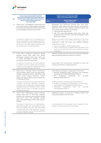 No.Area of Improvement (AOI) Hasil Self Assessment Penerapan GCG Tahun Buku 2023Area of Improvement (AOI) Self Assessment Results of GCG Implementation for Fiscal Year 2023Tindak Lanjut per 31 Desember 2024Follow-up as of December 31, 2024Status Bentuk Tindak LanjutFollow-up Form12 Direksi belum menindaklanjuti rekomendasi hasil assessment pemasok. Tidak terdapat rekomendasi khusus atas hasil assessment pemasok 2022 yang dapat ditingkatkan pada assessment 2023.The Board of Directors has not followed up on the recommendations of the supplier assessment results. There are no specific recommendations on the results of the 2022 supplier assessment that can be improved in the 2023 assessment.%uf0fc Berdasarkan hasil assessment pemasok tahun buku 2022, didapatkan bahwa dalam assessment pemasok yang dilakukan pada tahun 2023 ini telah mengalami kenaikan hasilnya yang menunjukkan adanya perbaikan di mana telah:1. Ada edaran buku pedoman PBJ.2. Ada TKO yang disosialisasikan pada tahun 2022 dan berdasarkan hasil ECS tahun 2023 ada peningkatan terkait penerimaan material. Based on the results of the supplier assessment for the 2022 financial year, it was found that in the supplier assessment conducted in 2023, the results had increased, indicating improvements in which:1. There is a circulation of the PBJ guideline book.2. There is a TKO that was socialized in 2022 and based on the results of the 2023 ECS there was an increase in material acceptance. 13 Direksi belum melakukan pembayaran kepada pemasok secara tepat waktu atas sample pembayaran pemasok pada tahun 2023, dari 10 sample pembayaran, terdapat 4 sample pembayaran yang belum tepat waktu.The Board of Directors has not made payments to suppliers on time for supplier payment samples in 2023, out of 10 payment samples, there were 4 payment samples that were not on time.%uf0fc Dilakukan perbaikan dan monitoring untuk memastikan ketepatan waktu pembayaran pemasok secara terus-menerus. Improvements and monitoring are conducted to ensure the continuous timeliness of supplier payments.14 Direksi belum menangani keluhan stakeholderssecara konsisten, efektif, tuntas, dan tepat wkatu. Terdapat penanganan keluhan stakeholder yang dikelola melalui layanan Pertamina Contact Center, dan layanan dikelola secara terpusat oleh PT Pertamina (Persero).The Board of Directors has not handled stakeholder complaints consistently, effectively, completely, and timely. There is stakeholder complaint handling managed through the Pertamina Contact Center service, and the service is managed centrally by PT Pertamina (Persero).%uf0fc Telah dilakukan penanganan menggunakan 2 (dua) acuan:1. Pedoman Pengelolaan Relasi, Komunikasi, dan Kredibilitas Perusahaan No. A-006/PHE040/2018-S9 Rev. 0.2. TKO Pengelolaan Stakeholder No. 813-008/PHE01000/2022-S9 Rev. 0Handling has been conducted using 2 (two) references:1. Guidelines of Managing Corporate Relations, Communication, and Credibility No. A-006/PHE040/2018-S9 Rev. 0.2. Stakeholder Management TKO No. 813-008/PHE01000/2022-S9 Rev. 015 Direksi belum melaksanakan program kemitraan dengan usaha kecil. PT PHE tidak mengelola pinjaman dan cashflow terkait kemitraan dengan usaha kecil, namun PHE melakukan inkubasi dalam hal pengembangan UMKM melalui program SMEXPO. The Board of Directors has not implemented a partnership program with small businesses. PHE does not manage loans and cash flow related to partnerships with small businesses, but PHE conducts incubation in terms of developing MSMEs through the SMEXPO program. %uf0fc Pelaksanaan program ini hanya ada di Holding. Program SHU hanya pemberdayaan bukan kemitraan. The implementation of this program is only in Holding. The SHU program is only empowerment, not partnership.Laporan Tahunan %u2022 Annual Report 340HULU ENERGI