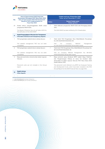 No.Area of Improvement (AOI) Hasil Self Assessment Penerapan GCG Tahun Buku 2023Area of Improvement (AOI) Self Assessment Results of GCG Implementation for Fiscal Year 2023Tindak Lanjut per 31 Desember 2024Follow-up as of December 31, 2024Status Bentuk Tindak LanjutFollow-up Form21 Direksi belum menyelenggarakan RUPS untuk pengesahan RKAP 2024.The Board of Directors has not yet held a GMS for the ratification of the 2024 RKAP.%uf0fc Telah dilakukan pengesahan RKAP 2024 oleh Pemegang Saham SHU.The 2024 RKAP has been ratified by SHU Shareholders.V Aspek Pengungkapan Informasi dan TransparansiInformation Disclosure and Transparency Aspects1 TKO pengelolaan website belum selesai disusun.The website management TKO has not been completed%uf0fc Telah terbit TKO Pengelolaan Situs Web/Website Perusahaan No. 89-005/PHE01000/2024-S9.TKO for Company Website Management No. 89-005/PHE01000/2024-S9 has been issued.2 TKO pengelolaan website belum selesai disusun. The website management TKO has not been completed.%uf0fc Telah terbit TKO Pengelolaan Situs Web/Website Perusahaan No. 89-005/PHE01000/2024-S9.TKO for Company Website Management No. 89-005/PHE01000/2024-S9 has been issued.3 Biaya personel belum dicantumkan dalam Laporan Tahunan.Personnel costs are not included in the Annual report.%uf0fc Biaya personel yang dimaksud BPKP adalah Biaya Pelatihan dan Pengembangan Pekerja di mana hal tersebut telah dimasukkan ke dalam Laporan Tahunan PHE Tahun Buku 2023 (pada halaman 254).The personnel costs referred to by BPKP are Employee Training and Development Costs, which have been included in the PHE Annual Report for the 2023 Financial Year. (on page 254).VI Aspek LainnyaOther Aspects- - - -%uf0fc = telah ditindaklanjuti/ has been followed up %uf0fb = belum ditindaklanjuti/ has not been followed upLaporan Tahunan %u2022 Annual Report 342HULU ENERGI