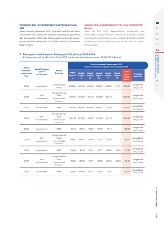 Perjalanan dan Perkembangan Hasil Penilaian GCG PHESejak penilaian penerapan GCG dilakukan pertama kali pada 2008, PHE terus melakukan evaluasi, pemantauan, perbaikan dan peningkatan GCG pada setiap aspeknya. Berikut riwayat proses penilaian penerapan GCG PHE selama 9 (sembilan) tahun terakhir.Journey and Development of PHE GCG Assessment ResultsSince the first GCG implementation assessment was conducted in 2008, PHE has continued to evaluate, monitor, improve and enhance GCG in every aspect. The following GCG implementation assessment process history PHE for the last 9 (nine) years.Tahun PenilaianAssessment YearJenis PenilaianType of AssessmentPenilaiAssessorSkor Assessment Penerapan GCGScore of the GCG Implementation AssessmentAspekAspect IAspek Aspect IIAspek Aspect IIIAspek Aspect IVAspek Aspect VAspekAspect VISkor AkhirFinal ScorePredikatPredicate2024 Assessment Sinergi Daya Prima 89,208 92,305 90,383 90,857 90,229 3,571 86,285 Sangat BaikVery Good2023 SelfAssessmentFungsi Internal AuditInternal Audit Function94,565 87,022 90,115 90,299 92,313 - 85,904 Sangat BaikVery Good2022 Assessment BPKP 93,486 86,067 88,583 89,857 92,311 - 85,052 Sangat BaikVery Good2021 SelfAssessmentFungsi Internal Audit Internal Audit Function96,743 87,540 94,187 94,303 91,133 - 89,449 Sangat BaikVery Good2020 Assessment BPKP 96,74 87,34 92,27 92,37 91,13 - 88,08 Sangat BaikVery Good2019 SelfAssessmentFungsi Internal Audit Internal Audit Function98,60 88,46 94,66 91,37 92,48 - 87,50 Sangat BaikVery Good2018 Assessment BPKP 94,66 85,51 92,41 90,77 89,63 12,50 87,32 Sangat BaikVery Good2017 SelfAssessmentFungsi Internal Audit Internal Audit Function96,28 89,38 93,71 89,25 80,18 12,50 86,66 Sangat BaikVery Good2016 Assessment BPKP 95,65 80,88 93,00 85,53 77,54 - 83,44 Sangat BaikVery GoodPencapaian Hasil Asesmen Penerapan GCG, Periode 2016-2024Achievement of the Results of the GCG Implementation Assessment, 2016-2024 Period0102030405 Good Corporate Governance Tata kelola Perusahaan0607 PT Pertamina Hulu Energi 343