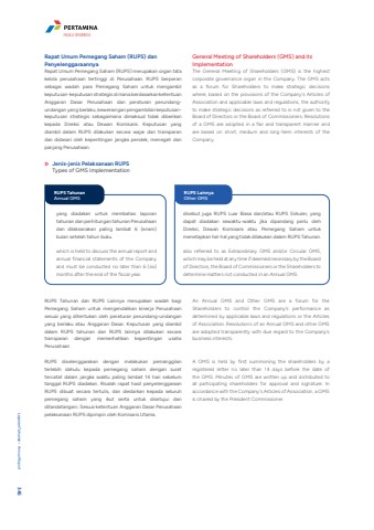 Rapat Umum Pemegang Saham (RUPS) dan PenyelenggaraannyaRapat Umum Pemegang Saham (RUPS) merupakan organ tata kelola perusahaan tertinggi di Perusahaan. RUPS berperan sebagai wadah para Pemegang Saham untuk mengambil keputusan-keputusan strategis di mana berdasarkan ketentuan Anggaran Dasar Perusahaan dan peraturan perundangundangan yang berlaku, kewenangan pengambilan keputusankeputusan strategis sebagaimana dimaksud tidak diberikan kepada Direksi atau Dewan Komisaris. Keputusan yang diambil dalam RUPS dilakukan secara wajar dan transparan dan didasari oleh kepentingan jangka pendek, menegah dan panjang Perusahaan.RUPS Tahunan dan RUPS Lainnya merupakan wadah bagi Pemegang Saham untuk mengendalikan kinerja Perusahaan sesuai yang ditentukan oleh peraturan perundang-undangan yang berlaku atau Anggaran Dasar. Keputusan yang diambil dalam RUPS tahunan dan RUPS lainnya dilakukan secara transparan dengan memerhatikan kepentingan usaha Perusahaan.RUPS diselenggarakan dengan melakukan pemanggilan terlebih dahulu kepada pemegang saham dengan surat tercatat dalam jangka waktu paling lambat 14 hari sebelum tanggal RUPS diadakan. Risalah rapat hasil penyelenggaraan RUPS dibuat secara tertulis, dan diedarkan kepada seluruh pemegang saham yang ikut serta untuk disetujui dan ditandatangani. Sesuai ketentuan Anggaran Dasar Perusahaan pelaksanaan RUPS dipimpin oleh Komisaris Utama.Jenis-jenis Pelaksanaan RUPSTypes of GMS ImplementationGeneral Meeting of Shareholders (GMS) and its Implementation The General Meeting of Shareholders (GMS) is the highest corporate governance organ in the Company. The GMS acts as a forum for Shareholders to make strategic decisions where, based on the provisions of the Company's Articles of Association and applicable laws and regulations, the authority to make strategic decisions as referred to is not given to the Board of Directors or the Board of Commissioners. Resolutions of a GMS are adopted in a fair and transparent manner and are based on short, medium and long-term interests of the Company.An Annual GMS and Other GMS are a forum for the Shareholders to control the Company's performance as determined by applicable laws and regulations or the Articles of Association. Resolutions of an Annual GMS and other GMS are adopted transparently with due regard to the Company's business interests.A GMS is held by first summoning the shareholders by a registered letter no later than 14 days before the date of the GMS. Minutes of GMS are written up and distributed to all participating shareholders for approval and signature. In accordance with the Company's Articles of Association, a GMS is chaired by the President Commissioner.RUPS Tahunan Annual GMSyang diadakan untuk membahas laporan tahunan dan perhitungan tahunan Perusahaan dan dilaksanakan paling lambat 6 (enam) bulan setelah tahun buku.which is held to discuss the annual report and annual financial statements of the Company and must be conducted no later than 6 (six) months after the end of the fiscal year.RUPS Lainnya Other GMSdisebut juga RUPS Luar Biasa dan/atau RUPS Sirkuler, yang dapat diadakan sewaktu-waktu jika dipandang perlu oleh Direksi, Dewan Komisaris atau Pemegang Saham untuk menetapkan hal-hal yang tidak dilakukan dalam RUPS Tahunan.also referred to as Extraordinary GMS and/or Circular GMS, which may be held at any time if deemed necessary by the Board of Directors, the Board of Commissioners or the Shareholders to determine matters not conducted in an Annual GMS.Laporan Tahunan %u2022 Annual Report 346HULU ENERGI