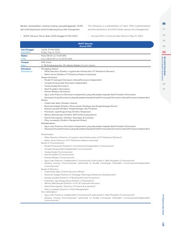 Berikut disampaikan masing-masing penyelenggaraan RUPS dan hasil keputusan serta tindak lanjutnya oleh manajemen.%u2022 RUPS Tahunan Tahun Buku 2023 tanggal 31 Mei 2023RUPS TahunanAnnual GMSHari/TanggalDay/Date: Jumat, 31 Mei 2024Friday, May 31, 2024WaktuTime: Pukul 08.33 s.d. 10.49 WIBFrom 08.33 AM to 10.49 AM WIBTempatPlace: PHE TowerJl. TB Simatupang Kav. 99 Jakarta Selatan | South JakartaKehadiranAttendance: Pemegang Saham%u2022 Alfian Nasution (Direktur Logistik dan Infrastruktur PT Pertamina (Persero)%u2022 Rahmi Amini (Direktur PT Pertamina Pedeve Indonesia)Dewan Komisaris%u2022 Rinaldi Firmansyah (Komisaris Utama/Komisaris Independen)%u2022 Tumpak Simanjuntak (Komisaris Independen)%u2022 Tutuka Ariadji (Komisaris)%u2022 Abdi Mustakim (Komisaris)%u2022 Paiman Raharjo (Komisaris)%u2022 Agus Joko Pramono (Komisaris Independen) yang dikuasakan kepada Abdi Mustakim (Komisaris)%u2022 Nanang Untung (Komisaris) yang dikuasakan kepada Rinaldi Firmansyah (Komisaris Utama/Komisaris Independen)Direksi%u2022 Chalid Said Salim (Direktur Utama)%u2022 Rachmat Hidajat (Direktur Perencanaan Strategis dan Pengembangan Bisnis)%u2022 Awang Lazuardi (Direktur Pengembangan dan Produksi)%u2022 Muharram Jaya Panguriseng (Direktur Eksplorasi)%u2022 Whisnu Bahriansyah (Direktur SDM & Penunjang Bisnis)%u2022 Dannif Danusaputro (Direktur Keuangan & Investasi)%u2022 Mery Luciawaty (Direktur Manajemen Risiko).Ketidakhadiran%u2022 Agus Joko Pramono (Komisaris Independen) yang dikuasakan kepada Abdi Mustakim (Komisaris)%u2022 Nanang Untung (Komisaris) yang dikuasakan kepada Rinaldi Firmansyah (Komisaris Utama/Komisaris Independen)Shareholders%u2022 Alfian Nasution (Director of Logistics and Infrastructure of PT Pertamina (Persero))%u2022 Rahmi Amini (Director of PT Pertamina Pedeve Indonesia)Board of Commissioners%u2022 Rinaldi Firmansyah (President Commissioner/Independent Commissioner)%u2022 Tumpak Simanjuntak (Independent Commissioner)%u2022 Tutuka Ariadji (Commissioner)%u2022 Abdi Mustakim (Commissioner)%u2022 Paiman Raharjo (Commissioner)%u2022 Agus Joko Pramono (Independent Commissioner) authorized to Abdi Mustakim (Commissioner)%u2022 Nanang Untung (Commissioner) authorized to Rinaldi Firmansyah (President Commissioner/Independent Commissioner)Board of Directors%u2022 Chalid Said Salim (Chief Executive Officer)%u2022 Rachmat Hidajat (Director of Strategic Planning and Business Development)%u2022 Awang Lazuardi (Director of Development and Production)%u2022 Muharram Jaya Panguriseng (Director of Exploration)%u2022 Whisnu Bahriansyah (Director of HC & Corporate Services)%u2022 Dannif Danusaputro (Director of Finance & invesment)%u2022 Mery Luciawaty (Director of Risk Management)Non-attendance%u2022 Agus Joko Pramono (Independent Commissioner) authorized to Abdi Mustakim (Commissioner)%u2022 Nanang Untung (Commissioner) authorized to Rinaldi Firmansyah (President Commissioner/Independent Commissioner)The following is a presentation of each GMS implementation and the resolutions and their follow-ups by the management.%u2022 Annual GMS in Financial Year 2023 on May 31, 20230102030405 Good Corporate Governance Tata kelola Perusahaan0607 PT Pertamina Hulu Energi 349
