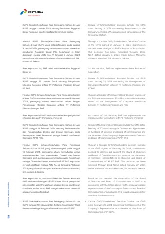 %u2022 RUPS Sirkuler/Keputusan Para Pemegang Saham di Luar RUPS tanggal 3 Januari 2024 tentang Perubahan Anggaran Dasar Perseroan dan Pembatalan Greenshoe Option.Melalui RUPS Sirkuler/Keputusan Para Pemegang Saham di Luar RUPS yang ditandatangani pada tanggal 3 Januari 2024, pemegang saham memutuskan melakukan perubahan Anggaran Dasar PHE. Keputusan ini telah diaktakan melalui Akta No. 11 tanggal 9 Januari 2024 yang dibuat di hadapan Marianne Vincentia Hamdani, SH., notaris di Jakarta.Atas keputusan ini, PHE telah memberlakukan Anggaran Dasar ini.%u2022 RUPS Sirkuler/Keputusan Para Pemegang Saham di Luar RUPS tanggal 23 Januari 2024 tentang Pengelolaan Interaksi Korporasi antara PT Pertamina (Persero) dengan PT PHE.Melalui RUPS Sirkuler/Keputusan Para Pemegang Saham di Luar RUPS yang ditandatangani pada tanggal 23 Januari 2024, pemegang saham memutuskan terkait dengan Pengelolaan Interaksi Korporasi antara PT Pertamina (Persero) dengan PHE.Atas keputusan ini PHE telah memberlakukan pengelolaan interaksi dengan PT Pertamina (Persero).%u2022 RUPS Sirkuler/Keputusan Para Pemegang Saham di Luar RUPS tanggal 18 Februari 2024 tentang Pemberhentian dan Pengangkatan Direksi dan Dewan Komisaris serta Penempatan Wakil Perseroan sebagai Direksi dan Dewan Komisaris AP PT PHE.Melalui RUPS Sirkuler/Keputusan Para Pemegang Saham di Luar RUPS yang ditandatangani pada tanggal 18 Februari 2024, pemegang saham memutuskan untuk memberhentikan dan mengangkat Direksi dan Dewan Komisaris serta pengusulan penempatan wakil Perusahaan sebagai Direksi dan Dewan Komisaris AP PT PHE. Keputusan ini telah diaktakan melalui Akta No. 52 tanggal 27 Februari 2024 yang dibuat di hadapan Marianne Vincentia Hamdani, SH., notaris di Jakarta.Atas keputusan ini, susunan Direksi dan Dewan Komisaris PHE telah sesuai dengan KPSSS di atas. Untuk pengusulan penempatan wakil Perusahaan sebagai Direksi dan Dewan Komisaris entitas anak, PHE mengeluarkan surat tersendiri atas penunjukkan tersebut.%u2022 RUPS Sirkuler/Keputusan Para Pemegang Saham di Luar RUPS tanggal 29 Februari 2024 tentang Penempatan Wakil Perseroan sebagai Anggota Dewan Komisaris PT PEPC.%u2022 Circular GMS/Shareholders' Decision Outside the GMS dated January 3, 2024 concerning Amendments to the Company's Articles of Association and Cancellation of the Greenshoe Option.Through a Circular GMS/Shareholders' Decision Outside of the GMS signed on January 3, 2024, shareholders decided make changes to PHE's Articles of Association. This decision has been notarized through Deed No.11 dated January 9, 2024 made before Marianne Vincentia Hamdani, SH., notary in Jakarta.On this decision, PHE has implemented these Articles of Association.%u2022 Circular GMS/Shareholders' Decision Outside the GMS dated January 23, 2024 concerning the Management of Corporate Interaction between PT Pertamina (Persero) and PT PHE.Through a Circular GMS/Shareholders' Decision Outside of the GMS signed on January 23, 2024, shareholders decided related to the Management of Corporate Interaction between PT Pertamina (Persero) and PHE.As a result of this decision, PHE has implemented the management of interactions with PT Pertamina (Persero).%u2022 Circular GMS/Shareholders' Decision Outside the GMS dated February 18, 2024 concerning the Dismissal and Appointment of the Board of Directors and Board of Commissioners and the Placement of the Company's Representatives as Directors and Board of Commissioners of AP PT PHE.Through a Circular GMS/Shareholders' Decision Outside of the GMS signed on February 18, 2024, shareholders decided to dismiss and appoint the Board of Directors and Board of Commissioners and propose the placement of Company representatives as Directors and Board of Commissioners of AP PT PHE. This decision has been notarized through Deed No.52 dated February 27, 2024 before Marianne Vincentia Hamdani, SH., notary in Jakarta.Based on this decision, the composition of the Board of Directors and Board of Commissioners of PHE is in accordance with the KPSSS above. For the proposal to place representatives of the Company as Directors and Board of Commissioners of subsidiaries, PHE issued a separate letter regarding the appointment.%u2022 Circular GMS/Shareholders' Decision Outside the GMS dated February 29, 2024 concerning the Placement of the Company's Representative as a Member of the Board of Commissioners of PT PEPC.Laporan Tahunan %u2022 Annual Report 352HULU ENERGI