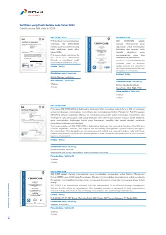 Sertifikasi yang Masih Berlaku pada Tahun 2024Certifications Still Valid in 2024ISO 27001: 2022PHE berhasil mempertahankan sertifikasi ISO 27001:2022 melalui audit surveillence yang telah dilakukan pada akhir tahun 2024.PHE successfully maintained its ISO 27001:2022 certification through a surveillance audit conducted at the end of 2024.Entitas / Entity-Diterbitkan oleh / Issued byBritish Standar InstitutionMasa berlaku / Valid until3 Tahun3 YearsISO 37001:2016 Penerapan ISO 37001:2016 di Subholding Upstream telah mencakup seluruh fungsi. ISO ini bertujuan untuk membangun, menerapkan, memelihara, dan meningkatkan Sistem Manajemen Anti Penyuapan (SMAP) di seluruh organisasi. Standar ini membantu perusahaan dalam mencegah, mendeteksi, dan merespons risiko penyuapan, baik yang dilakukan oleh internal perusahaan maupun pihak eksternal, guna menciptakan lingkungan bisnis yang transparan, beretika, dan sesuai dengan peraturan perundang-undangan yang berlaku. The implementation of ISO 37001:2016 in Subholding Upstream has covered all functions. This ISO aims to build, implement, maintain, and improve the Anti-Bribery Management System (ABMS) throughout the organization. This standard helps companies prevent, detect, and respond to bribery risks, both those carried out by internal companies and external parties, in order to create a transparent, ethical, and compliant business environment.Entitas / Entity-Diterbitkan oleh / Issued byBritish standard instituteInstitutions that Issue Certification: British Standards InstituteMasa berlaku / Valid until3 Tahun3 YearsISO 50001:2018 ISO 5001 adalah standar internasional yang menetapkan persyaratan untuk Sistem Manajemen Energi (SME) yang efektif pada Perusahaan. Standar ini menyediakan kerangka kerja untuk membantu Perusahaan meningkatkan kinerja energi, mengurangi konsumsi energi dan mengurangi biaya terkait energi.ISO 50001 is an international standard that sets requirements for an effective Energy Management System (EnMS) within an organization. This standard provides a framework to help organizations improve energy performance, reduce energy consumption, and lower energy-related costs.Entitas / EntityPHE ONWJ, PHM, PEP Dongi Matindok Field, JOB Medco E&P Tomori Sulawesi, PT Badak NGLDiterbitkan oleh / Issued byIntertek, SucofindoMasa berlaku / Valid until3 Tahun3 YearsISO 9001:2015ISO 9001:2015 adalah standar internasional yang digunakan untuk menetapkan kebijakan dan sasaran mutu (quality objective) serta pencapaiannya yang bisa diterapkan di perusahaan.ISO 9001:2015 is an international standard used to establish quality policies and objectives and their achievements that can be applied in companies.Entitas / Entity-Diterbitkan oleh / Issued byBritish standard institute, Sucofindo, SGS, AQC, PSCMasa berlaku / Valid until3 Tahun3 YearsCertificate of RegistrationINFORMATION SECURITY MANAGEMENT SYSTEM - ISO/IEC 27001:2022This is to certify that: PT Pertamina Hulu EnergiPHE Tower, 20th FloorJl. Let. Jen. TB Simatupang Kav. 99Kebagusan, Pasar Minggu,Jakarta SelatanIndonesia 12520Holds Certificate No: IS 733704and operates an Information Security Management System which complies with the requirements of ISO/IEC27001:2022 for the following scope:Information Security Management Systems (ISMS) applies to the Provision of InformationProtection, Cyber Security and Digital Defense Services in Upstream Oil and Gas BusinessActivities consisting of Perimeter Security Services, Web Security Services, Endpoint SecurityServices, Remote Working Security Services, Activity Monitoring Services and Data SecurityServices provided to Internal Users at Head Office managed by the Information TechnologySubdirectorate of PT Pertamina Hulu Energi Subholding Upstream. This is in accordance withthe Statement of Applicability No: SMKI-002/PHE53000/2023-S0 rev.0 dated 18 July 2023.Previous certificate expiries on 06/01/2024Recertification audit ended 13/12/2023For and on behalf of BSI:Emmanuel Herve, Managing Director, ASEANOriginal Registration Date: 2021-01-07 Effective Date: 2024-02-14Latest Revision Date: 2024-02-14 Expiry Date: 2027-01-06Page: 1 of 1This certificate was issued electronically and remains the property of BSI and is bound by the conditions of contract.An electronic certificate can be authenticated online.Printed copies can be validated at www.bsi-global.com/ClientDirectory or telephone +62 21 806 49 600 or +62 21 227 678 09.Further clarifications regarding the scope of this certificate and the applicability of ISO/IEC 27001:2022 requirements may be obtained by consulting theorganization.This certificate is valid only if provided original copies are in complete set.Information and Contact: BSI, Kitemark Court, Davy Avenue, Knowlhill, Milton Keynes MK5 8PP. Tel: + 44 345 080 9000BSI Assurance UK Limited, registered in England under number 7805321 at 389 Chiswick High Road, London W4 4AL, UK.Indonesia Headquarters: Talavera Office Suite 20th Floor, Suite #01-06 Jl. TB Simatupang Kav. 22 - 26, Cilandak,Jakarta Selatan , DKI Jakarta 12430, Indonesia. Tel: +62 21 2276 7809 ; +62 21 8064 9600 Fax: +62 21 2276 8271A Member of the BSI Group of Companies.Laporan Tahunan %u2022 Annual Report 34PT Pertamina Hulu Energi 35HULU ENERGI