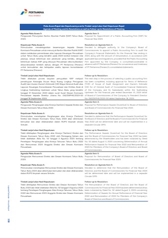 Mata Acara Rapat dan Keputusannya serta Tindak Lanjut atas Hasil Keputusan RapatAgenda of Meeting and its Resolutions as well as Follow-up to Resolutions of Meeting Agenda Mata Acara 3:Pengusulan Penunjukan Kantor Akuntan Publik (KAP) Tahun Buku 2023.Keputusan Mata Acara 3:Memutuskan mendelegasikan kewenangan kepada Dewan Komisaris Perusahaan untuk menunjuk Kantor Akuntan Publik (KAP) dalam melakukan pemeriksaan atas Laporan Keuangan Perusahaan untuk Tahun Buku yang berakhir pada 2023 berikut besaran nilai jasanya, sesuai ketentuan dan peraturan yang berlaku, dengan ketentuan bahwa KAP yang ditunjuk Perusahaan dikonsultasikan/dikoordinasikan terlebih dahulu dengan PT Pertamina (Persero) untuk kemudahan dan ketepatan waktu laporan konsolidasian PT Pertamina (Persero).Tindak Lanjut atas Hasil Keputusan:Telah dilakukan proses lanjutan penujukkan KAP meliputi persetujuan Kerangka Acuan Kerja Ruang Lingkup Penugasan Audit) dan Usulan Owner%u2019s Estimate (OE) Biaya General Audit atas Laporan Keuangan Konsolidasian Perusahaan dan Entitas Anak di Lingkup Subholding Upstream untuk Tahun Buku yang berakhir tanggal 31 Desember 2023 dalam surat Surat Dewan Komisaris Perusahaan kepada Direktur Utama No. 062/DKPHE/2023-S0 tanggal 18 September 2023.Agenda Item 3:Proposal for Appointment of a Public Accounting Firm (KAP) for Financial Year 2023.Resolution on Agenda Item 3:Decided to delegate authority to the Company's Board of Commissioners to appoint a Public Accounting Firm to audit the Company's Financial Statements for the Financial Year ending in 2023, along with the amount of remuneration, in accordance with applicable laws and regulations, provided that the Public Accounting Firm appointed by the Company is consulted/coordinated in advance with PT Pertamina (Persero) for convenience and timeliness of PT Pertamina (Persero)'s consolidated statements.Follow-up to Resolution:The next step in the process of selecting a public accounting firm has been completed, including approval for Terms of Reference (TOR) of Scope of Audit Assignment and Owner's Estimate (OE) for of General Audit of Consolidated Financial Statements of the Company and Its Subsidiaries within the Subholding Upstream for the financial year ended December 31, 2023 letter of Board of Commissioners of the Company to President Director No. 062/DKPHE/2023-S0 dated September 18, 2023.Agenda Mata Acara 4:Pengusulan Penghargaan atas Kinerja (tantiem) kepada Direksi dan Dewan Komisaris Tahun Buku 2022.Keputusan Mata Acara 4:Memutuskan menetapkan Penghargaan atas Kinerja (Tantiem) Direksi dan Dewan Komisaris Tahun Buku 2022 akan ditentukan kemudian dan akan dilaksanakan dalam RUPS terpisah secara Sirkuler.Tindak Lanjut atas Hasil Keputusan:Telah ditetapkan Penghargaan atas Kinerja (Tantiem) Direksi dan Dewan Komisaris Tahun Buku 2022 oleh Pemegang Saham dan telah diaktakan Akta No. 52 tanggal 3 Agustus 2023 tentang Penetapan Penghargaan atas Kinerja Tahunan Tahun Buku 2022 dan Remunerasi 2023 Anggota Direksi dan Dewan Komisaris Perusahaan.Agenda Item 4:Proposal for Performance Awards (Incentive) to Board of Directors and Board of Commissioners for Financial Year 2022.Resolution on Agenda Item 4:Decided to determine that the Performance Awards (Incentive) for the Board of Directors and the Board of Commissioners for Financial Year 2022 will be determined later and will be implemented in a separate Circular GMS.Follow-up to Resolution:The Performance Awards (Incentive) for the Board of Directors and the Board of Commissioners for Financial Year 2022 has been determined by the Shareholders and has been notarized by Deed No. 52 dated August 3, 2023 concerning Determination of Annual Performance Awards for Financial Year 2022 and Remuneration of 2023 for Members of the Company's Board of Directors and Board of Commissioners.Agenda Mata Acara 5:Pengusulan Remunerasi Direksi dan Dewan Komisaris Tahun Buku 2023.Keputusan Mata Acara 5:Memutuskan menetapkan Remunerasi Direksi dan Dewan Komisaris Tahun Buku 2023 akan ditentukan kemudian dan akan dilaksanakan dalam RUPS terpisah secara Sirkuler.Tindak Lanjut atas Hasil Keputusan:Telah ditetapkan Remunerasi Direksi dan Dewan Komisaris Tahun Buku 2023 dan telah diaktakan Akta No. 52 tanggal 3 Agustus 2023 tentang Penetapan Penghargaan Atas Kinerja Tahunan Tahun Buku 2022 dan Remunerasi 2023 Anggota Direksi dan Dewan Komisaris Perusahaan.Agenda Item 5:Proposal for Remuneration of Board of Directors and Board of Commissioners for Financial Year 2023.Resolution on Agenda Item 5:Decided to determine that the Remuneration of the Board of Directors and the Board of Commissioners for Financial Year 2023 will be determined later and will be implemented in a separate Circular GMS.Follow-up to Resolution:The Remuneration of the Board of Directors and the Board of Commissioners for Financial Year 2023 has been determined and has been notarized by Deed No. 52 dated August 3, 2023 concerning Determination of Awards for Annual Performance of Financial Year 2022 and Remuneration of 2023 for Members of the Company's Board of Directors and Board of Commissioners. Laporan Tahunan %u2022 Annual Report 358HULU ENERGI