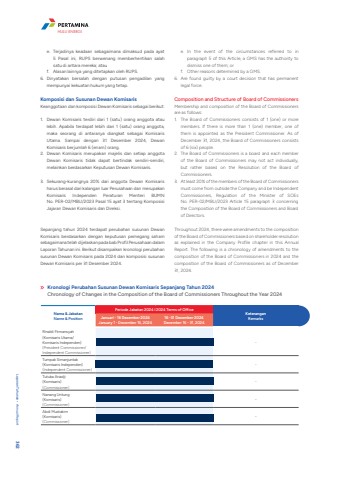 e. Terjadinya keadaan sebagaimana dimaksud pada ayat 5 Pasal ini, RUPS berwenang memberhentikan salah satu di antara mereka; atauf. Alasan lainnya yang ditetapkan oleh RUPS.6. Dinyatakan bersalah dengan putusan pengadilan yang mempunyai kekuatan hukum yang tetap.Komposisi dan Susunan Dewan KomisarisKeanggotaan dan komposisi Dewan Komisaris sebagai berikut:1. Dewan Komisaris terdiri dari 1 (satu) orang anggota atau lebih. Apabila terdapat lebih dari 1 (satu) orang anggota, maka seorang di antaranya diangkat sebagai Komisaris Utama. Sampai dengan 31 Desember 2024, Dewan Komisaris berjumlah 6 (enam) orang.2. Dewan Komisaris merupakan majelis dan setiap anggota Dewan Komisaris tidak dapat bertindak sendiri-sendiri, melainkan berdasarkan Keputusan Dewan Komisaris.3. Sekurang-kurangnya 20% dari anggota Dewan Komisaris harus berasal dari kalangan luar Perusahaan dan merupakan Komisaris Independen Peraturan Menteri BUMN No. PER-02/MBU/2023 Pasal 15 ayat 3 tentang Komposisi Jajaran Dewan Komisaris dan Direksi. Sepanjang tahun 2024 terdapat perubahan susunan Dewan Komisaris berdasarkan dengan keputusan pemegang saham sebagaimana telah dijelaskan pada bab Profil Perusahaan dalam Laporan Tahunan ini. Berikut disampaikan kronologi perubahan susunan Dewan Komisaris pada 2024 dan komposisi susunan Dewan Komisaris per 31 Desember 2024.e. In the event of the circumstances referred to in paragraph 5 of this Article, a GMS has the authority to dismiss one of them; orf. Other reasons determined by a GMS.6. Are found guilty by a court decision that has permanent legal force.Composition and Structure of Board of CommissionersMembership and composition of the Board of Commissioners are as follows:1. The Board of Commissioners consists of 1 (one) or more members. If there is more than 1 (one) member, one of them is appointed as the President Commissioner. As of December 31, 2024, the Board of Commissioners consists of 6 (six) people.2. The Board of Commissioners is a board and each member of the Board of Commissioners may not act individually, but rather based on the Resolution of the Board of Commissioners.3. At least 20% of the members of the Board of Commissioners must come from outside the Company and be Independent Commissioners, Regulation of the Minister of SOEs No. PER-02/MBU/2023 Article 15 paragraph 3 concerning the Composition of the Board of Commissioners and Board of Directors.Throughout 2024, there were amendments to the composition of the Board of Commissioners based on shareholder resolution as explained in the Company Profile chapter in this Annual Report. The following is a chronology of amendments to the composition of the Board of Commissioners in 2024 and the composition of the Board of Commissioners as of December 31, 2024.Nama & JabatanName & PositionPeriode Jabatan 2024 I 2024 Terms of Office KeteranganRemarks Januari - 16 Desember 2024January 1 - December 16, 202416 -31 Desember 2024December 16 - 31, 2024Rinaldi Firmansyah (Komisaris Utama/Komisaris Independen)(President Commissioner/Independent Commissioner)-Tumpak Simanjuntak (Komisaris Independen)(Independent Commissioner)-Tutuka Ariadji (Komisaris)(Commissioner)-Nanang Untung (Komisaris)(Commissioner)-Abdi Mustakim(Komisaris) (Commissioner)-Kronologi Perubahan Susunan Dewan Komisaris Sepanjang Tahun 2024Chronology of Changes in the Composition of the Board of Commissioners Throughout the Year 2024Laporan Tahunan %u2022 Annual Report 362HULU ENERGI
