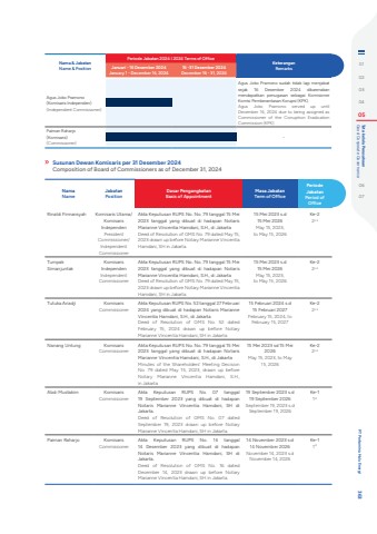 Susunan Dewan Komisaris per 31 Desember 2024Composition of Board of Commissioners as of December 31, 2024NamaNameJabatanPositionDasar PengangkatanBasis of AppointmentMasa JabatanTerm of OfficePeriode JabatanPeriod of OfficeRinaldi Firmansyah Komisaris Utama/Komisaris IndependenPresident Commissioner/Independent CommissionerAkta Keputusan RUPS No. No. 79 tanggal 15 Mei 2023 tanggal yang dibuat di hadapan Notaris Marianne Vincentia Hamdani, S.H., di JakartaDeed of Resolution of GMS No. 79 dated May 15, 2023 drawn up before Notary Marianne Vincentia Hamdani, SH in Jakarta.15 Mei 2023 s.d 15 Mei 2026May 15, 2023, to May 15, 2026Ke-22ndTumpak SimanjuntakKomisaris IndependenIndependent CommissionerAkta Keputusan RUPS No. No. 79 tanggal 15 Mei 2023 tanggal yang dibuat di hadapan Notaris Marianne Vincentia Hamdani, S.H., di JakartaDeed of Resolution of GMS No. 79 dated May 15, 2023 drawn up before Notary Marianne Vincentia Hamdani, SH in Jakarta.15 Mei 2023 s.d 15 Mei 2026May 15, 2023, to May 15, 2026Ke-22ndTutuka Ariadji KomisarisCommissionerAkta Keputusan RUPS No. 52 tanggal 27 Februari 2024 yang dibuat di hadapan Notaris Marianne Vincentia Hamdani, S.H., di JakartaDeed of Resolution of GMS No. 52 dated February 15, 2024 drawn up before Notary Marianne Vincentia Hamdani, SH in Jakarta15 Februari 2024 s.d 15 Februari 2027February 15, 2024, to February 15, 2027Ke-22ndNanang Untung KomisarisCommissionerAkta Keputusan RUPS No. No. 79 tanggal 15 Mei 2023 tanggal yang dibuat di hadapan Notaris Marianne Vincentia Hamdani, S.H., di JakartaMinutes of the Shareholders%u2019 Meeting Decision No. 79 dated May 15, 2023, drawn up before Notary Marianne Vincentia Hamdani, S.H., in Jakarta.15 Mei 2023 sd 15 Mei 2026May 15, 2023, to May 15, 2026Ke-22ndAbdi Mustakim KomisarisCommissionerAkta Keputusan RUPS No. 07 tanggal 19 September 2023 yang dibuat di hadapan Notaris Marianne Vincentia Hamdani, SH di Jakarta.Deed of Resolution of GMS No. 07 dated September 19, 2023 drawn up before Notary Marianne Vincentia Hamdani, SH in Jakarta.19 September 2023 s.d 19 September 2026September 19, 2023 s.d September 19, 2026Ke-11stPaiman Raharjo KomisarisCommissionerAkta Keputusan RUPS No. 16 tanggal 14 Desember 2023 yang dibuat di hadapan Notaris Marianne Vincentia Hamdani, SH di Jakarta.Deed of Resolution of GMS No. 16 dated December 14, 2023 drawn up before Notary Marianne Vincentia Hamdani, SH in Jakarta.14 November 2023 s.d 14 November 2026November 14, 2023 s.d November 14, 2026Ke-11stNama & JabatanName & PositionPeriode Jabatan 2024 I 2024 Terms of Office KeteranganRemarks Januari - 16 Desember 2024January 1 - December 16, 202416 -31 Desember 2024December 16 - 31, 2024Agus Joko Pramono(Komisaris Independen)(Independent Commissioner)Agus Joko Pramono sudah tidak lagi menjabat sejak 16 Desember 2024 dikarenakan mendapatkan penugasan sebagai Komisioner Komisi Pemberantasan Korupsi (KPK).Agus Joko Pramono served up until December 16, 2024 due to being assigned as Commissioner of the Corruption Eradication Commission (KPK).Paiman Raharjo(Komisaris)(Commissioner)-0102030405 Good Corporate Governance Tata kelola Perusahaan0607 PT Pertamina Hulu Energi 363