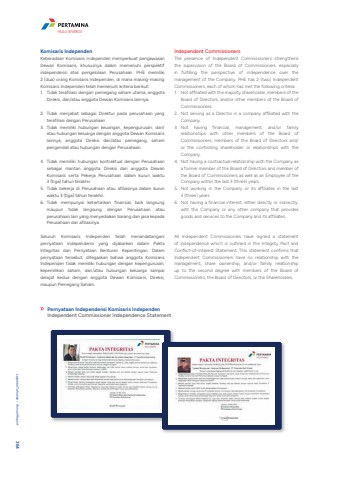 Komisaris IndependenKeberadaan Komisaris Independen memperkuat pengawasan Dewan Komisaris, khususnya dalam memenuhi perspektif independensi atas pengelolaan Perusahaan. PHE memiliki 2 (dua) orang Komisaris Independen, di mana masing-masing Komisaris Independen telah memenuhi kriteria berikut:1. Tidak terafiliasi dengan pemegang saham utama, anggota Direksi, dan/atau anggota Dewan Komisaris lainnya.2. Tidak menjabat sebagai Direktur pada perusahaan yang terafiliasi dengan Perusahaan.3. Tidak memiliki hubungan keuangan, kepengurusan, dan/atau hubungan keluarga dengan anggota Dewan Komisaris lainnya, anggota Direksi dan/atau pemegang, saham pengendali atau hubungan dengan Perusahaan.4. Tidak memiliki hubungan kontraktual dengan Perusahaan sebagai mantan anggota Direksi dan anggota Dewan Komisaris serta Pekerja Perusahaan dalam kurun waktu 3 (tiga) tahun terakhir.5. Tidak bekerja di Perusahaan atau afiliasinya dalam kurun waktu 3 (tiga) tahun terakhir.6. Tidak mempunyai ketertarikan finansial, baik langsung maupun tidak langsung dengan Perusahaan atau perusahaan lain yang menyediakan barang dan jasa kepada Perusahaan dan afiliasinya.Seluruh Komisaris Independen telah menandatangani pernyataan independensi yang dijabarkan dalam Pakta Integritas dan Pernyataan Benturan Kepentingan. Dalam pernyataan tersebut, ditegaskan bahwa anggota Komisaris Independen tidak memiliki hubungan dengan kepengurusan, kepemilikan saham, dan/atau hubungan keluarga sampai derajat kedua dengan anggota Dewan Komisaris, Direksi, maupun Pemegang Saham.Independent CommissionersThe presence of Independent Commissioners strengthens the supervision of the Board of Commissioners, especially in fulfilling the perspective of independence over the management of the Company. PHE has 2 (two) Independent Commissioners, each of whom has met the following criteria:1. Not affiliated with the majority shareholder, members of the Board of Directors, and/or other members of the Board of Commissioners.2. Not serving as a Director in a company affiliated with the Company.3. Not having financial, management, and/or family relationships with other members of the Board of Commissioners, members of the Board of Directors and/or the controlling shareholder or relationships with the Company.4. Not having a contractual relationship with the Company as a former member of the Board of Directors and member of the Board of Commissioners as well as an Employee of the Company within the last 3 (three) years.5. Not working in the Company or its affiliates in the last 3 (three) years.6. Not having a financial interest, either directly or indirectly, with the Company or any other company that provides goods and services to the Company and its affiliates.All Independent Commissioners have signed a statement of independence which is outlined in the Integrity Pact and Conflict-of-Interest Statement. This statement confirms that Independent Commissioners have no relationship with the management, share ownership, and/or family relationship up to the second degree with members of the Board of Commissioners, the Board of Directors, or the Shareholders.Pernyataan Independensi Komisaris IndependenIndependent Commissioner Independence StatementLaporan Tahunan %u2022 Annual Report 364HULU ENERGI