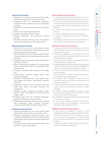 Tugas Dewan Komisaris1. Mengawasi dan memberikan nasihat kepada Direksi dalam menjalankan pengurusan atau kegiatan Perusahaan.2. Memberikan arahan dan melaksanakan pengawasan terhadap Direksi atas implementasi rencana dan kebijakan Perusahaan.3. Memberikan persetujuan RJPP dan RKAP yang diajukan Direksi.4. Memantau dan mengevaluasi kinerja Direksi.5. Mengawasi pelaksanaan Manajemen Risiko.6. Mengkaji pembangunan dan pemanfaatan teknologi informasi.7. Mengawasi efektivitas penerapan GCG dan kepatuhan Perusahaan terhadap peraturan perundang-undangan.Wewenang Dewan Komisaris1. Melihat buku-buku, surat-surat, serta dokumen lainnya, memeriksa kas untuk keperluan verifikasi dan lain-lain surat berharga, serta kekayaan Perusahaan.2. Meminta penjelasan dari Direksi dan/atau pejabat lainnya mengenai segala persoalan yang menyangkut pengelolaan Perusahaan.3. Mengetahui segala kebijakan dan tindakan yang telah dan akan dijalankan Direksi.4. Meminta Direksi dan/atau pejabat lain di bawah Direksi dengan sepengetahuan Direksi untuk menghadiri Rapat Dewan Komisaris.5. Mengangkat Sekretaris Dewan Komisaris, jika dianggap perlu.6. Memberhentikan sementara anggota Direksi sesuai ketentuan yang berlaku.7. Membentuk komite-komite lain selain Komite Audit, jika dianggap perlu dengan memperhatikan ketentuan Pemerintah.8. Menggunakan tenaga ahli untuk hal tertentu dan dalam jangka waktu tertentu atas beban Perusahaan, jika dianggap perlu.9. Melakukan tindakan pengurusan Perusahaan dalam keadaan tertentu untuk jangka waktu sesuai ketentuan Anggaran Dasar.10. Menghadiri rapat Direksi dan memberikan pandanganpandangan terhadap hal-hal yang dibicarakan.11. Melaksanakan kewenangan pengawasan lainnya sepanjang tidak bertentangan dengan peraturan perundangundangan, Anggaran Dasar, dan/atau Keputusan RUPS.Kewajiban Dewan Komisaris1. Memberikan pendapat dan saran secara tertulis kepada RUPS mengenai RJPP dan RKAP yang diusulkan Direksi.2. Mengikuti perkembangan kegiatan Perusahaan, serta memberikan pendapat dan saran kepada RUPS mengenai setiap masalah yang dianggap penting bagi kepengurusan Perusahaan.3. Melaporkan dengan segera kepada RUPS apabila terjadi gejala menurunnya kinerja Perusahaan.Duties of Board of Commissioners1. To supervise and give advice to the Board of Directors in performing the management or activities of the Company.2. To provide direction and supervise the Board of Directors on the implementation of the Company's plans and policies.3. To approve RJPP and RKAP submitted by the Board of Directors.4. To monitor and evaluate the performance of the Board of Directors.5. To oversee the implementation of Risk Management.6. To review the development and utilization of information technology.7. To oversee the effectiveness of GCG implementation and the Company's compliance with laws and regulations.Authority of Board of Commissioners1. To view books, letters, and other documents, to check the cash for verification purposes and other securities, as well as the Company's assets.2. To request an explanation from the Board of Directors and/or other officials regarding all matters relating to the management of the Company.3. To know all policies and actions that the Board of Directors has implemented and will implement.4. To request the Board of Directors and/or other officials under the Board of Directors with the knowledge of the Board of Directors to attend a Board of Commissioners%u2019 Meeting.5. To appoint a Secretary to the Board of Commissioners, if deemed necessary.6. To temporarily dismiss members of the Board of Directors in accordance with applicable regulations. 7. To establish other committees besides the Audit Committee, if deemed necessary with due observance of government regulations.8. To employ experts for certain matters and within a certain period of time at the Company's expense, if deemed necessary.9. To perform Company management actions in certain circumstances for a period of time in accordance with the provisions of the Articles of Association.10. To attend Board of Directors%u2019 meetings and to provide input on the matters discussed.11. To exercise other supervisory authorities as long as they do not contradict laws and regulations, the Articles of Association, and/or Resolutions of GMS.Obligations of Board of Commissioners1. To give opinions and suggestions in writing to a GMS regarding RJPP and RKAP proposed by the Board of Directors.2. To follow the development of the Company's activities, and to give opinions and suggestions to a GMS regarding any issues deemed important for the management of the Company.3. To report immediately to a GMS if there are symptoms of a decline in the Company's performance.0102030405 Good Corporate Governance Tata kelola Perusahaan0607 PT Pertamina Hulu Energi 365