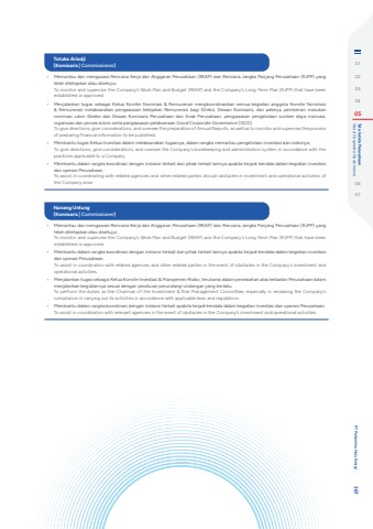 %u2022 Memantau dan mengawasi Rencana Kerja dan Anggaran Perusahaan (RKAP) dan Rencana Jangka Panjang Perusahaan (RJPP) yang telah ditetapkan atau disetujui. To monitor and supervise the Company%u2019s Work Plan and Budget (RKAP) and the Company%u2019s Long-Term Plan (RJPP) that have been established or approved.%u2022 Membantu dalam rangka koordinasi dengan instansi terkait dan pihak terkait lainnya apabila terjadi kendala dalam kegiatan investasi dan operasi Perusahaan.To assist in coordination with related agencies and other related parties in the event of obstacles in the Company's investment and operational activities.%u2022 Menjalankan tugas sebagai Ketua Komite Investasi & Manajemen Risiko, terutama dalam penelaahan atas ketaatan Perusahaan dalam menjalankan kegiatannya sesuai dengan peraturan perundang-undangan yang berlaku.To perform the duties as the Chairman of the Investment & Risk Management Committee, especially in reviewing the Company's compliance in carrying out its activities in accordance with applicable laws and regulations.%u2022 Membantu dalam rangka koordinasi dengan instansi terkait apabila terjadi kendala dalam kegiatan investasi dan operasi Perusahaan.To assist in coordination with relevant agencies in the event of obstacles in the Company's investment and operational activities.%u2022 Memantau dan mengawasi Rencana Kerja dan Anggaran Perusahaan (RKAP) dan Rencana Jangka Panjang Perusahaan (RJPP) yang telah ditetapkan atau disetujui.To monitor and supervise the Company%u2019s Work Plan and Budget (RKAP) and the Company%u2019s Long-Term Plan (RJPP) that have been established or approved.%u2022 Menjalankan tugas sebagai Ketua Komite Nominasi & Remunerasi mengkoordinasikan semua kegiatan anggota Komite Nominasi & Remunerasi melaksanakan pengawasan kebijakan Remunerasi bagi Direksi, Dewan Komisaris, dan pekerja, pemberian masukan nominasi calon Direksi dan Dewan Komisaris Perusahaan dan Anak Perusahaan, pengawasan pengelolaan sumber daya manusia, organisasi dan proses bisnis serta pengawasan pelaksanaan Good Corporate Governance (GCG).To give directions, give considerations, and oversee the preparation of Annual Reports, as well as to monitor and supervise the process of preparing financial information to be published.%u2022 Membantu tugas Ketua Investasi dalam melaksanakan tugasnya, dalam rangka memantau pengelolaan investasi dan risikonya. To give directions, give considerations, and oversee the Company's bookkeeping and administration system in accordance with the practices applicable to a Company.%u2022 Membantu dalam rangka koordinasi dengan instansi terkait dan pihak terkait lainnya apabila terjadi kendala dalam kegiatan investasi dan operasi Perusahaan.To assist in coordinating with related agencies and other related parties should obstacles in investment and operational activities of the Company arise.Tutuka Ariadji (Komisaris | Commissioner) Nanang Untung (Komisaris | Commissioner)0102030405 Good Corporate Governance Tata kelola Perusahaan0607 PT Pertamina Hulu Energi 367