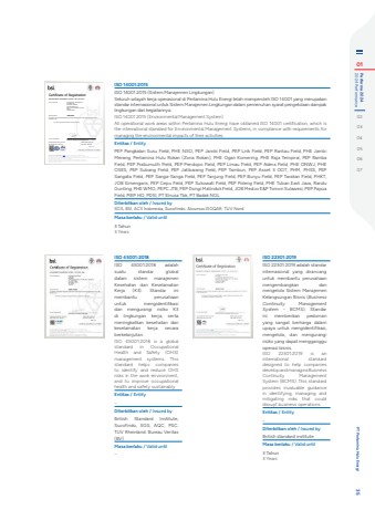 ISO 14001:2015ISO 14001:2015 (Sistem Manajemen Lingkungan)Seluruh wilayah kerja operasional di Pertamina Hulu Energi telah memperoleh ISO 14001 yang merupakan standar internasional untuk Sistem Manajemen Lingkungan dalam pemenuhan syarat pengelolaan dampak lingkungan dari kegiatannya.ISO 14001:2015 (Environmental Management System)All operational work areas within Pertamina Hulu Energi have obtained ISO 14001 certification, which is the international standard for Environmental Management Systems, in compliance with requirements for managing the environmental impacts of their activities.Entitas / EntityPEP Pangkalan Susu Field, PHE NSO, PEP Jambi Field, PEP Lirik Field, PEP Rantau Field, PHE Jambi Merang, Pertamina Hulu Rokan (Zona Rokan), PHE Ogan Komering, PHE Raja Tempirai, PEP Ramba Field, PEP Prabumulih Field, PEP Pendopo Field, PEP Limau Field, PEP Adera Field, PHE ONWJ, PHE OSES, PEP Subang Field, PEP Jatibarang Field, PEP Tambun, PEP Asset 3 OGT, PHM, PHSS, PEP Sangata Field, PEP Sanga-Sanga Field, PEP Tanjung Field, PEP Bunyu Field, PEP Tarakan Field, PHKT, JOB Simengaris, PEP Cepu Field, PEP Sukowati Field, PEP Poleng Field, PHE Tuban East Java, Randu Gunting, PHE WMO, PEPC JTB, PEP Dongi Matindok Field, JOB Medco E&P Tomori Sulawesi, PEP Papua Field, PIEP HO, PDSI, PT Elnusa Tbk, PT Badak NGLDiterbitkan oleh / Issued bySGS, BSI, ACS Indonesia, Sucofindo, Alcumus ISOQAR, TUV NordMasa berlaku / Valid until3 Tahun3 YearsISO 45001:2018 ISO 45001:2018 adalah suatu standar global dalam sistem manajemen Kesehatan dan Keselamatan Kerja (K3). Standar ini membantu perusahaan untuk mengidentifikasi dan mengurangi risiko K3 di lingkungan kerja, serta meningkatkan kesehatan dan keselamatan kerja secara berkelanjutan.ISO 45001:2018 is a global standard in Occupational Health and Safety (OHS) management systems. This standard helps companies to identify and reduce OHS risks in the work environment, and to improve occupational health and safety sustainably.Entitas / Entity-Diterbitkan oleh / Issued byBritish Standard Institute, Sucofindo, SGS, AQC, PSC. TUV Rheinland. Bureau Veritas (BV)Masa berlaku / Valid until-ISO 22301:2019ISO 22301:2019 adalah standar internasional yang dirancang untuk membantu perusahaan mengembangkan dan mengelola Sistem Manajemen Kelangsungan Bisnis (Business Continuity Management System - BCMS). Standar ini memberikan pedoman yang sangat berharga dalam upaya untuk mengidentifikasi, mengelola, dan mengurangi risiko yang dapat mengganggu operasi bisnis.ISO 22301:2019 is an international standard designed to help companies develop and manage a Business Continuity Management System (BCMS). This standard provides invaluable guidance in identifying, managing and mitigating risks that could disrupt business operations.Entitas / Entity-Diterbitkan oleh / Issued byBritish standard instituteMasa berlaku / Valid until3 Tahun3 YearsCertificate of RegistrationENVIRONMENTAL MANAGEMENT SYSTEM - ISO 14001:2015This is to certify that: PT Pertamina EP Cepu Regional 4Indonesia TimurHead Office Regional 4,Patra Jasa Office TowerJalan Jend. Gatot Subroto Kav 32-34,JakartaIndonesia 12950Holds Certificate No: EMS 602056and operates an Environmental Management System which complies with the requirements of ISO 14001:2015 forthe following scope:The provision of production activities of oil and gas companyFor and on behalf of BSI:Michael Lam - Managing Director Assurance, APACOriginal Registration Date: 2013-09-08 Effective Date: 2022-09-08Latest Revision Date: 2023-09-23 Expiry Date: 2025-09-07Page: 1 of 3This certificate was issued electronically and remains the property of BSI and is bound by the conditions of contract.An electronic certificate can be authenticated online.Printed copies can be validated at www.bsi-global.com/ClientDirectory or telephone +62 21 806 49 600 or +62 21 227 678 09.Further clarifications regarding the scope of this certificate and the applicability of ISO 14001:2015 requirements may be obtained by consulting the organization.This certificate is valid only if provided original copies are in complete set.Information and Contact: BSI, Kitemark Court, Davy Avenue, Knowlhill, Milton Keynes MK5 8PP. Tel: + 44 345 080 9000BSI Assurance UK Limited, registered in England under number 7805321 at 389 Chiswick High Road, London W4 4AL, UK.A Member of the BSI Group of Companies.01 2024 Performance Performa 2024020304050607Laporan Tahunan %u2022 Annual Report 34PT Pertamina Hulu Energi 35