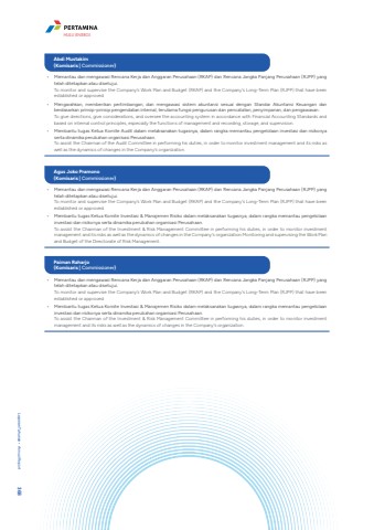 %u2022 Memantau dan mengawasi Rencana Kerja dan Anggaran Perusahaan (RKAP) dan Rencana Jangka Panjang Perusahaan (RJPP) yang telah ditetapkan atau disetujui.To monitor and supervise the Company%u2019s Work Plan and Budget (RKAP) and the Company%u2019s Long-Term Plan (RJPP) that have been established or approved.%u2022 Mengarahkan, memberikan pertimbangan, dan mengawasi sistem akuntansi sesuai dengan Standar Akuntansi Keuangan dan berdasarkan prinsip-prinsip pengendalian internal, terutama fungsi pengurusan dan pencatatan, penyimpanan, dan pengawasan.To give directions, give considerations, and oversee the accounting system in accordance with Financial Accounting Standards and based on internal control principles, especially the functions of management and recording, storage, and supervision.%u2022 Membantu tugas Ketua Komite Audit dalam melaksanakan tugasnya, dalam rangka memantau pengelolaan investasi dan risikonya serta dinamika perubahan organisasi Perusahaan.To assist the Chairman of the Audit Committee in performing his duties, in order to monitor investment management and its risks as well as the dynamics of changes in the Company's organization.Abdi Mustakim (Komisaris | Commissioner)%u2022 Memantau dan mengawasi Rencana Kerja dan Anggaran Perusahaan (RKAP) dan Rencana Jangka Panjang Perusahaan (RJPP) yang telah ditetapkan atau disetujui.To monitor and supervise the Company%u2019s Work Plan and Budget (RKAP) and the Company%u2019s Long-Term Plan (RJPP) that have been established or approved.%u2022 Membantu tugas Ketua Komite Investasi & Manajemen Risiko dalam melaksanakan tugasnya, dalam rangka memantau pengelolaan investasi dan risikonya serta dinamika perubahan organisasi Perusahaan.To assist the Chairman of the Investment & Risk Management Committee in performing his duties, in order to monitor investment management and its risks as well as the dynamics of changes in the Company's organization.Monitoring and supervising the Work Plan and Budget of the Directorate of Risk Management.Agus Joko Pramono (Komisaris | Commissioner)%u2022 Memantau dan mengawasi Rencana Kerja dan Anggaran Perusahaan (RKAP) dan Rencana Jangka Panjang Perusahaan (RJPP) yang telah ditetapkan atau disetujui. To monitor and supervise the Company%u2019s Work Plan and Budget (RKAP) and the Company%u2019s Long-Term Plan (RJPP) that have been established or approved.%u2022 Membantu tugas Ketua Komite Investasi & Manajemen Risiko dalam melaksanakan tugasnya, dalam rangka memantau pengelolaan investasi dan risikonya serta dinamika perubahan organisasi Perusahaan.To assist the Chairman of the Investment & Risk Management Committee in performing his duties, in order to monitor investment management and its risks as well as the dynamics of changes in the Company's organization.Paiman Raharjo (Komisaris | Commissioner)Laporan Tahunan %u2022 Annual Report 368HULU ENERGI