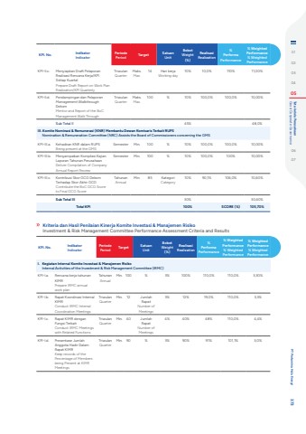 KPI. No. IndikatorIndicatorPeriodePeriod Target SatuanUnitBobotWeight(%)RealisasiRealization%PerformaPerformance% WeightedPerformance% WeightedPerformanceKPI-II.c. Menyiapkan Draft Pelaporan Realisasi Rencana Kerja/KPI Setiap KuartalPrepare Draft Report on Work Plan Realization/KPI QuarterlyTriwulanQuarterMaks.Max.14 Hari kerjaWorking day10% 10,0% 110% 11,00%KPI-II.d. Pendampingan dan Pelaporan Management WalkthroughDekomMentor and Report of the BoC Management Walk Through TriwulanQuarterMaks.Max.100 % 10% 100,0% 100,0% 10,00%Sub Total II 45% 48,0%III. Komite Nominasi & Remunerasi (KNR) Membantu Dewan Komisaris Terkait RUPSNomination & Remuneration Committee (NRC) Assists the Board of Commissioners concerning the GMSKPI-III.a. Kehadiran KNR dalam RUPSBeing present at the GMSSemester Min. 100 % 10% 100,0% 100,0% 10,00%KPI-III.b. Menyampaikan Kompilasi Kajian Laporan Tahunan PerusahaanDeliver Compilation of Company Annual Report ReviewSemester Min. 100 % 10% 100,0% 100% 10,00%KPI-III.c. Kontribusi Skor GCG Dekom Terhadap Skor Akhir GCGContribute the BoC GCG Score to Final GCG ScoreTahunanAnnualMin. 85 KategoriCategory10% 90,1% 106,0% 10,60%Sub Total III 30% 30,60%Total KPI 100% SCORE (%) 105,70%Kriteria dan Hasil Penilaian Kinerja Komite Investasi & Manajemen RisikoInvestment & Risk Management Committee Performance Assessment Criteria and ResultsKPI. No. IndikatorIndicatorPeriodePeriod Target SatuanUnitBobotWeight(%)RealisasiRealization%PerformaPerformance% WeightedPerformance% WeightedPerformance% WeightedPerformance% WeightedPerformanceI. Kegiatan Internal Komite Investasi & Manajemen RisikoInternal Activities of the Investment & Risk Management Committee (IRMC)KPI-I.a. Rencana kerja tahunan KIMRPrepare IRMC annual work planTahunanAnnualMin. 100 % 3% 100% 110,0% 110,0% 3,30%KPI-I.b. Rapat Koordinasi Internal KIMRConduct IRMC Internal Coordination MeetingsTriwulanQuarterMin. 12 Jumlah RapatNumber of Meetings3% 12% 19,0% 110,0% 3,3%KPI-I.c. Rapat KIMR dengan Fungsi TerkaitConduct IRMC Meetings with Related FunctionsTriwulanQuarterMin. 40 Jumlah RapatNumber of Meetings4% 40% 48% 110,0% 4,4%KPI-I.d. Presentase Jumlah Anggota Hadir Dalam Rapat KIMRKeep records of the Percentage of Members being Present at KIMR MeetingsTriwulanQuarterMin. 90 % 3% 90% 91% 101,1% 3,0%0102030405 Good Corporate Governance Tata kelola Perusahaan0607 PT Pertamina Hulu Energi 373
