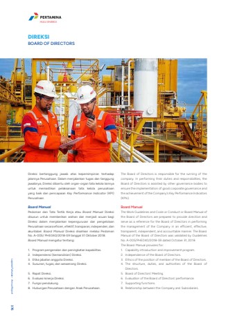 Direksi bertanggung jawab atas kepemimpinan terhadap jalannya Perusahaan. Dalam menjalankan tugas dan tanggung jawabnya, Direksi dibantu oleh organ-organ tata kelola lainnya untuk memastikan pelaksanaan tata kelola perusahaan yang baik dan pencapaian Key Performance Indicator (KPI) Perusahaan.Board ManualPedoman dan Tata Tertib Kerja atau Board Manual Direksi disusun untuk memberikan arahan dan menjadi acuan bagi Direksi dalam menjalankan kepengurusan dan pengelolaan Perusahaan secara efisien, efektif, transparan, independen, dan akuntabel. Board Manual Direksi disahkan melalui Pedoman No. A-005/ PHE040/2018-S9 tanggal 31 Oktober 2018. Board Manual mengatur tentang:1. Program pengenalan dan peningkatan kapabilitas.2. Independensi (kemandirian) Direksi.3. Etika jabatan anggota Direksi.4. Susunan, tugas, dan wewenang Direksi.5. Rapat Direksi.6. Evaluasi kinerja Direksi.7. Fungsi pendukung.8. Hubungan Perusahaan dengan Anak Perusahaan. The Board of Directors is responsible for the running of the company. In performing their duties and responsibilities, the Board of Directors is assisted by other governance bodies to ensure the implementation of good corporate governance and the achievement of the Company's Key Performance Indicators (KPIs).Board Manual The Work Guidelines and Code or Conduct or Board Manual of the Board of Directors are prepared to provide direction and serve as a reference for the Board of Directors in performing the management of the Company in an efficient, effective, transparent, independent, and accountable manner. The Board Manual of the Board of Directors was validated by Guidelines No. A-005/PHE040/2018-S9 dated October 31, 2018. The Board Manual provides for:1. Capability introduction and improvement program.2. Independence of the Board of Directors.3. Ethics of the position of member of the Board of Directors.4. The structure, duties, and authorities of the Board of Directors.5. Board of Directors%u2019 Meeting.6. Evaluation of the Board of Directors' performance.7. Supporting functions.8. Relationship between the Company and Subsidiaries.DIREKSIBOARD OF DIRECTORSLaporan Tahunan %u2022 Annual Report 376HULU ENERGI