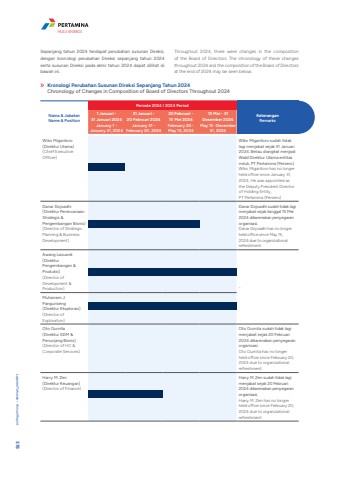 Sepanjang tahun 2024 terdapat perubahan susunan Direksi, dengan kronologi perubahan Direksi sepanjang tahun 2024 serta susunan Direksi pada akhir tahun 2024 dapat dilihat di bawah ini. Throughout 2024, there were changes in the composition of the Board of Directors. The chronology of these changes throughout 2024 and the composition of the Board of Directors at the end of 2024 may be seen below.Kronologi Perubahan Susunan Direksi Sepanjang Tahun 2024Chronology of Changes in Composition of Board of Directors Throughout 2024Nama & JabatanName & PositionPeriode 2024 I 2024 PeriodKeteranganRemarks1 Januari - 31 Januari 2024January 1 - January 31, 202431 Januari - 20 Februari 2024January 31 - February 20, 202420 Februari - 15 Mei 2024February 20 - May 15, 2024 15 Mei - 31 Desember 2024May 15 -December 31, 2024Wiko Migantoro (Direktur Utama)(Chief Executive Officer)Wiko Migantoro sudah tidak lagi menjabat sejak 31 Januari 2024. Beliau diangkat menjadi Wakil Direktur Utama entitas induk, PT Pertamina (Persero).Wiko Migantoro has no longer held office since January 31, 2024. He was appointed as the Deputy President Director of Holding Entity, PT Pertamina (Persero).Danar Dojoadhi (Direktur Perencanaan Strategis & Pengembangan Bisnis)(Director of Strategic Planning & Business Development)Danar Dojoadhi sudah tidak lagi menjabat sejak tanggal 15 Mei 2024 dikarenakan penyegaran organisasi.Danar Dojoadhi has no longer held office since May 15, 2024 due to organizational refreshment.Awang Lazuardi (Direktur Pengembangan & Produksi)(Director of Development & Production) -Muharram J. Panguriseng (Direktur Eksplorasi)(Director of Exploration)Oto Gurnita (Direktur SDM & Penunjang Bisnis)(Director of HC & Corporate Services)Oto Gurnita sudah tidak lagi menjabat sejak 20 Februari 2024 dikarenakan penyegaran organisasi. Oto Gurnita has no longer held office since February 20, 2024 due to organizational refreshment.Harry M. Zen (Direktur Keuangan)(Director of Finance)Harry M. Zen sudah tidak lagi menjabat sejak 20 Februari 2024 dikarenakan penyegaran organisasi.Harry M. Zen has no longer held office since February 20, 2024 due to organizational refreshment.Laporan Tahunan %u2022 Annual Report 378HULU ENERGI