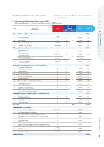 Kriteria dan Hasil Penilaian Kinerja Fungsi HSSECriteria and Results of Performance Assessment of HSSE Function Berikut disampaikan KPI dari komite pendukung Direksi. The following are the KPIs from the Board of Directors' supporting committee.No Nama KPIName of KPI Unit% Bobot% Weight Perf % WPSub TotalA. Perspektif Finansial | Financial Perspective 17,551. EBITDA Subholding USDJuta / Million 51798,67% 4,932. ROIC %u2265 WACC % 4 110,00% 4,403. Production Cost per Unit USD/BOE 5 101,45% 5,074. Overhead Cost to EBITDA Per-Myriad 3 104,76% 3,14B. Perspektif Customer Focus | Customer Focus Perspective 12,521. Implementasi ESGESG Implementation %512110,00%5,50 a. Skor Rating ESGESG Rating Score Indeks / Index 110,00%b. Reduksi Emisi CO2eCO2e Emission Reduction KTon CO2e 110,00%2. Produksi Minyak & GasOil & Gas Production MBOEPD 7 100,31% 7,02C. Perspektif Internal Process | Internal Process Perspective 60,221. Peningkatan Budaya HSSEHSSE Culture Improvement % 455110,00% 4,402. HSSE Excellence % 8 109,20% 8,743. Security Excellence % 8 110,00% 8,804. Environmental Excellence % 8 109,98% 8,805. Health Excellence % 8 110,00% 8,806. Process Safety & Asset Integrity Initiatives % 8 109,46% 8,767. Pengelolaan LPC SHULPC SHU Management % 7 107,50% 7,538. Sertifikasi BCMS SubholdingBCMS Subholding Certification % 2 110,00% 2,209. Cyber Security Resiliency Program % 2 110,00% 2,20D. Perspektif Learning & Growth | Learning & Growth Perspective 16,681. Realisasi Investasi Investment Realization % 816103,84% 8,312. KSI & QMA % 4 104,24% 4,173. Living Core Value % 4 105,00% 4,20TOTAL KPI 100 106,96%E. Boundary KPI | KPI Boundaries1. Number of Accident (NoA) No. of Event (4,00%)2. GCG Implementation Compliance % 1,00%3.Optimalisasi Pelaksanaan Sinergi Pertamina GroupOptimization of the Implementation of Pertamina Group Synergies% 1,88%4. Pengelolaan RisikoRisk Management % 0,00%5. Tindak Lanjut Rekomendasi Hasil Audit Internal & Eksternal Follow-up on Internal & External Audit Result Recommendations % 0,00%6. Cost Optimization US$Juta / Million 1,50%7. Utilasi Sistem ERP % (1,00%)TOTAL FINAL KPI 106,34%0102030405 Good Corporate Governance Tata kelola Perusahaan0607 PT Pertamina Hulu Energi 385