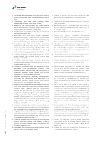 2. Memberikan atau memberikan pinjaman jangka panjang, kecuali pinjaman yang timbul karena pelaksanaan kegiatan usaha. 3. Mengagunkan aset tetap yang diperlukan dalam melaksanakan penarikan kredit jangka pendek. 4. Melepaskan dan menghapuskan aset tetap bergerak dengan umur ekonomis yang lazim berlaku dalam industri pada umumnya sampai dengan 5 (lima) tahun.5. Menghapuskan dari pembukuan terhadap piutang macet dan persediaan barang mati. 6. Mengadakan kerja sama lisensi, kontrak manajemen, menyewakan aset, kerja sama operasi, dan perjanjian kerja sama lainnya yang dalam bidang usaha Perusahaan yang melebihi nilai tertentu yang ditetapkan oleh RUPS. 7. Mengadakan kerja sama lisensi, kontrak manajemen, menyewakan aset, kerja sama operasi, dan kerja sama lainnya yang tidak dalam bidang usaha Perusahaan untuk jangka waktu tidak lebih dari 1 (satu) tahun atau yang melebihi nilai tertentu yang ditetapkan oleh RUPS. 8. Melakukan penyertaan modal pada perusahaan lainnya dengan batasan nilai dan/atau kriteria tertentu yang ditetapkan oleh RUPS;9. Mendirikan anak perusahaan dan/atau perusahaan patungan dengan batasan nilai dan/atau kriteria tertentu yang ditetapkan oleh RUPS;10. Melepaskan penyertaan modal atau perubahan struktur permodalan yang mengakibatkan terjadinya dilusi kepemilikan saham Perseroan pada anak perusahaan atau perusahaan patungan, dengan batasan nilai dan/atau kriteria tertentu yang ditetapkan oleh RUPS;11. Melakukan penggabungan, peleburan, pengambilalihan, pemisahan, dan pembubaran anak perusahaan atau perusahaan patungan, dengan batasan nilai dan/atau kriteria tertentu yang ditetapkan oleh RUPS;12. Mengambil bagian baik sebagian atau seluruhnya atau ikut serta dalam partisipasi (participating interest) dengan ketentuan bahwa terhadap partisipasi (participating interest) atau pendirian anak perusahaan dalam rangka pengelolaan wilayah kerja migas hulu yang telah diperoleh, persetujuan pendirian anak perusahaannya dianggap telah diberikan pada saat disetujuinya rencana investasi wilayah kerja hulu dalam Rencana Kerja dan Anggaran Perusahaan dengan batasan nilai dan/atau kriteria tertentu yang ditetapkan oleh RUPS;13. Melepaskan sebagian atau seluruh penyertaan Perseroan dalam partisipasi (participating interest), dengan batasan nilai dan/atau kriteria tertentu yang ditetapkan oleh RUPS;14. Menjadikan aktiva tetap milik Perseroan sebagai penyertaan modal dalam perseroan lain atau dalam rangka mendirikan anak perusahaan, dengan batasan nilai dan/atau kriteria tertentu yang ditetapkan oleh RUPS;15. Perubahan terhadap rekening investasi dan/atau klasifikasi investasi sepanjang nilainya tidak melebihi anggaran investasi yang telah ditetapkan dalam Rencana Kerja dan Anggaran Perusahaan; dan;16. Menetapkan dan menyesuaikan struktur organisasi sampai dengan 1 (satu) tingkat di bawah Direksi.2. Providing or granting long-term loans, except for loans arising from the implementation of business activities.3. Collateralizing fixed assets required to conduct short-term credit withdrawals.4. Releasing and writing off movable fixed assets with an economic life that is generally applicable in the industry of up to 5 (five) years.5. Write off bad debts and dead stock from the books.6. Entering into licensing cooperation, management contracts, asset rentals, operational cooperation, and other cooperation agreements in the Company's business field that exceed a certain value determined by the GMS.7. Entering into licensing cooperation, management contracts, asset rental, operational cooperation, and other cooperation that is not within the Company's business field for a period of no more than 1 (one) year or exceeding a certain value determined by the GMS.8. Making capital investments in other companies with certain value limits and/or criteria determined by the GMS;9. Establish subsidiaries and/or joint ventures with certain value limits and/or criteria determined by the GMS;10. Releasing capital participation or changing the capital structure which results in dilution of the Company's share ownership in subsidiaries or joint ventures, with certain value limits and/or criteria as determined by the GMS;11. Conducting mergers, amalgamations, takeovers, separations and dissolutions of subsidiaries or joint ventures, with certain value limits and/or criteria as determined by the GMS;12. Taking part in part or in whole or participating in participation (participating interest) with the provision that for participation (participating interest) or establishment of a subsidiary in the framework of managing upstream oil and gas work areas that have been obtained, approval for the establishment of the subsidiary is deemed to have been given at the time the investment plan for the upstream work area is approved in the Company's Work Plan and Budget with certain value limits and/or criteria determined by the GMS;13. Releasing part or all of the Company's participation in participation (participating interest), with certain value limits and/or criteria determined by the GMS;14. Making the Company's fixed assets as capital participation in another company or in order to establish a subsidiary, with certain value limits and/or criteria determined by the GMS;15. Changes to investment accounts and/or investment classifications as long as the value does not exceed the investment budget set out in the Company's Work Plan and Budget; and;16. Establish and adjust the organizational structure up to 1 (one) level below the Board of Directors.Laporan Tahunan %u2022 Annual Report 392HULU ENERGI