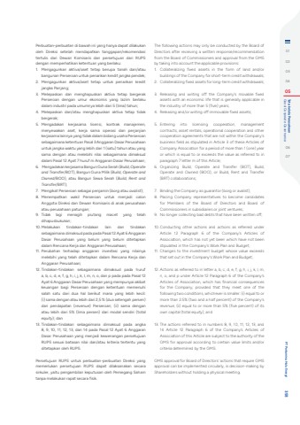 Perbuatan-perbuatan di bawah ini yang hanya dapat dilakukan oleh Direksi setelah mendapatkan tanggapan/rekomendasi tertulis dari Dewan Komisaris dan persetujuan dari RUPS dengan memperhatikan ketentuan yang berlaku:1. Mengagunkan aktiva/aset tetap berupa tanah dan/atau bangunan Perseroan untuk penarikan kredit jangka pendek; 2. Mengagunkan aktiva/aset tetap untuk penarikan kredit jangka Panjang; 3. Melepaskan dan menghapuskan aktiva tetap bergerak Perseroan dengan umur ekonomis yang lazim berlaku dalam industri pada umumnya lebih dari 5 (lima) tahun;4. Melepaskan dan/atau menghapuskan aktiva tetap tidak bergerak; 5. Mengadakan kerjasama lisensi, kontrak manajemen, menyewakan aset, kerja sama operasi dan perjanjian kerjasama lainnya yang tidak dalam bidang usaha Perseroan sebagaimana ketentuan Pasal 3 Anggaran Dasar Perusahaan untuk jangka waktu yang lebih dari 1 (satu) tahun atau yang sama dengan atau melebihi nilai sebagaimana dimaksud dalam Pasal 12 Ayat 7 huruf m Anggaran Dasar Perusahaan; 6. Mengadakan kerjasama Bangun Guna Serah (Build, Operate and Transfer/BOT), Bangun Guna Milik (Build, Operate and Owned/BOO), atau Bangun Sewa Serah (Build, Rent and Transfer/BRT); 7. Mengikat Perseroan sebagai penjamin (borg atau avalist); 8. Menempatkan wakil Perseroan untuk menjadi calon Anggota Direksi dan Dewan Komisaris di anak perusahaan atau perusahaan patungan; 9. Tidak lagi menagih piutang macet yang telah dihapusbukukan;10. Melakukan tindakan-tindakan lain dan tindakan sebagaimana dimaksud pada pada Pasal 12 Ayat 6 Anggaran Dasar Perusahaan yang belum yang belum ditetapkan dalam Rencana Kerja dan Anggaran Perusahaan; 11. Perubahan terhadap anggaran investasi yang nilainya melebihi yang telah ditetapkan dalam Rencana Kerja dan Anggaran Perusahaan; 12. Tindakan-tindakan sebagaimana dimaksud pada huruf a, b, c, d, e, f, g, h, i, j, k, l, m, n, o, dan p pada pada Pasal 12 Ayat 6 Anggaran Dasar Perusahaan yang mempunyai akibat keuangan bagi Perseroan dengan ketentuan memenuhi salah satu dari dua hal berikut mana yang lebih kecil: (i) sama dengan atau lebih dari 2,5 % (dua setengah persen) dari pendapatan (revenue) Perseroan; (ii) sama dengan atau lebih dari 5% (lima persen) dari modal sendiri (total equity); dan13. Tindakan-tindakan sebagaimana dimaksud pada angka 8, 9, 10, 11, 12, 13, dan 14 pada Pasal 12 Ayat 6 Anggaran Dasar Perusahaan yang menjadi kewenangan persetujuan RUPS sesuai batasan nilai dan/atau kriteria tertentu yang ditetapkan oleh RUPS.Persetujuan RUPS untuk perbuatan-perbuatan Direksi yang memerlukan persetujuan RUPS dapat dilaksanakan secara sirkuler, yaitu pengambilan keputusan oleh Pemegang Saham tanpa melakukan rapat secara fisik. The following actions may only be conducted by the Board of Directors after receiving a written response/recommendation from the Board of Commissioners and approval from the GMS by taking into account the applicable provisions:1. Collateralizing fixed assets in the form of land and/or buildings of the Company for short-term credit withdrawals;2. Collateralizing fixed assets for long-term credit withdrawals;3. Releasing and writing off the Company's movable fixed assets with an economic life that is generally applicable in the industry of more than 5 (five) years;4. Releasing and/or writing off immovable fixed assets;5. Entering into licensing cooperation, management contracts, asset rentals, operational cooperation and other cooperation agreements that are not within the Company's business field as stipulated in Article 3 of these Articles of Company Association for a period of more than 1 (one) year or which is equal to or exceeds the value as referred to in paragraph 7 letter m of this Article;6. Organizing Build, Operate and Transfer (BOT), Build, Operate and Owned (BOO), or Build, Rent and Transfer (BRT) collaborations;7. Binding the Company as guarantor (borg or avalist);8. Placing Company representatives to become candidates for Members of the Board of Directors and Board of Commissioners in subsidiaries or joint ventures;9. No longer collecting bad debts that have been written off;10. Conducting other actions and actions as referred under Article 12 Paragraph 6 of the Company%u2019s Articles of Association, which has not yet been which have not been stipulated in the Company's Work Plan and Budget;11. Changes to the investment budget whose value exceeds that set out in the Company's Work Plan and Budget;12. Actions as referred to in letter a, b, c, d, e, f, g, h, i, j, k, l, m, n, o, and p under Article 12 Paragraph 6 of the Company%u2019s Articles of Association, which has financial consequences for the Company, provided that they meet one of the following two conditions, whichever is smaller: (i) equal to or more than 2.5% (two and a half percent) of the Company's revenue; (ii) equal to or more than 5% (five percent) of its own capital (total equity); and13. The actions referred to in numbers 8, 9, 10, 11, 12, 13, and 14 Article 12 Paragraph 6 of the Company%u2019s Articles of Association of this Article are subject to the authority of the GMS for approval according to certain value limits and/or criteria determined by the GMS.GMS approval for Board of Directors' actions that require GMS approval can be implemented circularly, is decision-making by Shareholders without holding a physical meeting. 0102030405 Good Corporate Governance Tata kelola Perusahaan0607 PT Pertamina Hulu Energi 393