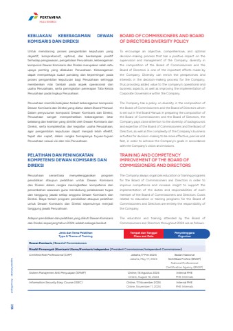 KEBIJAKAN KEBERAGAMAN DEWAN KOMISARIS DAN DIREKSIUntuk mendorong proses pengambilan keputusan yang objektif, komprehensif, optimal, dan berdampak positif terhadap pengawasan, pengelolaan Perusahaan, keberagaman komposisi Dewan Komisaris dan Direksi merupakan salah satu upaya penting yang dilakukan Perusahaan. Keberagaman dapat memperkaya sudut pandang dan kepentingan pada proses pengambilan keputusan bagi Perusahaan sehingga memberikan nilai tambah pada aspek operasional dan usaha Perusahaan, serta peningkatan penerapan Tata Kelola Perusahaan pada lingkup Perusahaan. Perusahaan memiliki kebijakan terkait keberagaman komposisi Dewan Komisaris dan Direksi yang diatur dalam Board Manual. Dalam penyusunan komposisi Dewan Komisaris dan Direksi, Perusahaan sangat memperhatikan keberagaman latar belakang dan keahlian yang dimiliki oleh Dewan Komisaris dan Direksi, serta kompleksitas dari kegiatan usaha Perusahaan, agar pengambilan keputusan dapat menjadi lebih efektif, tepat dan cepat, dalam rangka tercapainya tujuan-tujuan Perusahaan sesuai visi dan misi Perusahaan. PELATIHAN DAN PENINGKATAN KOMPETENSI DEWAN KOMISARIS DAN DIREKSIPerusahaan senantiasa menyelenggarakan program pendidikan ataupun pelatihan untuk Dewan Komisaris dan Direksi dalam rangka meningkatkan kompetensi dan penambahan wawasan guna mendukung pelaksanaan tugas dan tanggung jawab setiap anggota Dewan Komisaris dan Direksi. Biaya terkait program pendidikan ataupun pelatihan untuk Dewan Komisaris dan Direksi sepenuhnya menjadi tanggung jawab Perusahaan.Adapun pendidikan dan pelatihan yang diikuti Dewan Komisaris dan Direksi sepanjang tahun 2024 adalah sebagai berikut.BOARD OF COMMISSIONERS AND BOARD OF DIRECTORS DIVERSITY POLICYTo encourage an objective, comprehensive, and optimal decision-making process that has a positive impact on the supervision and management of the Company, diversity in the composition of the Board of Commissioners and the Board of Directors is one of the important efforts made by the Company. Diversity can enrich the perspectives and interests in the decision-making process for the Company, thus providing added value to the company's operational and business aspects, as well as improving the implementation of Corporate Governance within the Company. The Company has a policy on diversity in the composition of the Board of Commissioners and the Board of Directors which is set out in the Board Manual. In preparing the composition of the Board of Commissioners and the Board of Directors, the Company pays close attention to the diversity of backgrounds and expertise of the Board of Commissioners and the Board of Directors, as well as the complexity of the Company's business activities for decision-making to be more effective, precise and fast, in order to achieve the Company's goals in accordance with the Company's vision and missions. TRAINING AND COMPETENCY IMPROVEMENT OF THE BOARD OF COMMISSIONERS AND DIRECTORSThe Company always organizes education or training programs for the Board of Commissioners and Directors in order to improve competence and increase insight to support the implementation of the duties and responsibilities of each member of the Board of Commissioners and Directors. Costs related to education or training programs for the Board of Commissioners and Directors are entirely the responsibility of the Company.The education and training attended by the Board of Commissioners and Directors throughout 2024 are as follows.Jenis dan Tema PelatihanType & Theme of TrainingTempat dan TanggalPlace and DatePenyelenggaraOrganizerDewan Komisaris / Board of CommissionersRinaldi Firmansyah (Komisaris Utama/Komisaris Independen | President Commissioner/Independent Commissioner)Certified Risk Professional (CRP) Jakarta,17 Mei 2024Jakarta, May 17, 2024Badan Nasional Sertifikasi Profesi (BNSP) National Professional Certification Agency (BNSP)Sistem Manajemen Anti Penyuapan (SMAP) Online, 16 Agustus 2024Online, August 16, 2024Internal PHEPHE InternalsInformation Security Easy Course (ISEC) Online, 11 November 2024Online, November 11, 2024Internal PHEPHE InternalsLaporan Tahunan %u2022 Annual Report 394HULU ENERGI