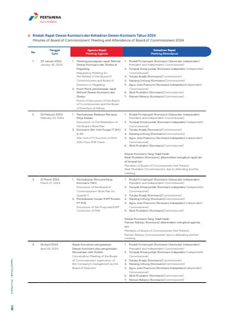 Risalah Rapat Dewan Komisaris dan Kehadiran Dewan Komisaris Tahun 2024Minutes of Board of Commissioners%u2019 Meeting and Attendance of Board of Commissioners 2024No. TanggalDateAgenda RapatMeeting AgendaKehadiran RapatMeeting Attendance1. 30 Januari 2024January 30, 20241. Meeting persiapaan rapat RetreatDewan Komisaris dan Direksi di MagelangPreparatory Meeting for the Retreat of the Board of Commissioners and Board of Directors in Magelang2. Point-Point pembahasan rapat Retreat Dewan Komisaris dan DireksiPoints of discussion of the Board of Commissioners and the Board of Directors of Retrea1. Rinaldi Firmansyah (Komisaris Utama dan Independen/President and Independent Commissioner)2. Tumpak Simanjuntak (Komisaris Indepeden/ Independent Commissioner)3. Tutuka Ariadji (Komisaris/Commissioner)4. Nanang Untung (Komisaris/Commissioner)5. Agus Joko Pramono (Komisaris Indepeden/Independent Commissioner)6. Abdi Mustakim (Komisaris/Commissioner)7. Paiman Raharjo (Komisaris/Commissioner)2. 23 Februari 2024February 23, 20241. Pembahasan Realisasi Rencana Kerja DewanDiscussion on the Realization of the Board's Work Plan2. Komisaris Site Visit Fungsi IT SHU lt. 20Site Visit of IT Function of SHU 20th Floor PHE Tower1. Rinaldi Firmansyah (Komisaris Utama dan Independen/President and Independent Commissioner)2. Tumpak Simanjuntak (Komisaris Indepeden/ Independent Commissioner)3. Tutuka Ariadji (Komisaris/Commissioner)4. Nanang Untung (Komisaris/Commissioner)5. Agus Joko Pramono (Komisaris Indepeden/ Independent Commissioner)6. Abdi Mustakim (Komisaris/Commissioner)Dewan Komisaris Yang Tidak Hadir:Abdi Mustakim (Komisaris), dikarenakan mengikuti rapat lain di tempat lainMembers of Board of Commissioners Not Present:Abdi Mustakim (Commissioner), due to attending another meeting3. 21 Maret 2024March 21, 20241. Pembahasan Rencana Kerja Komisaris TW IIDiscussion of the Board of Commissioners%u2019 Work Plan for Quarter II2. Pembahasan Usulan RJPP Koreksi PT PHEDiscussion of the Proposed RJPP Correction of PHE1. Rinaldi Firmansyah (Komisaris Utama dan Independen/President and Independent Commissioner)2. Tumpak Simanjuntak (Komisaris Indepeden/ Independent Commissioner)3. Tutuka Ariadji (Komisaris/Commissioner)4. Nanang Untung (Komisaris/Commissioner)5. Agus Joko Pramono (Komisaris Indepeden/ Independent Commissioner)6. Abdi Mustakim (Komisaris/Commissioner)Dewan Komisaris Yang Tidak Hadir:Paiman Raharjo (Komisaris) dikarenakan mengikuti agenda lainMembers of Board of Commissioners Not Present:Paiman Raharjo (Commissioner) due to attending another meeting4. 26 April 2024April 26, 2024Rapat Koordinasi pengawasan Dewan Komisaris atas pengelolaan Perusahaan oleh Direksi.Coordination Meeting of the Board of Commissioners' supervision of the Company's management by the Board of Directors.1. Rinaldi Firmansyah (Komisaris Utama dan Independen/President and Independent Commissioner)2. Tumpak Simanjuntak (Komisaris Indepeden/ Independent Commissioner)3. Tutuka Ariadji (Komisaris/Commissioner)4. Nanang Untung (Komisaris/Commissioner)5. Agus Joko Pramono (Komisaris Indepeden/Independent Commissioner)6. Abdi Mustakim (Komisaris/Commissioner)7. Paiman Raharjo (Komisaris/Commissioner)Laporan Tahunan %u2022 Annual Report 398HULU ENERGI