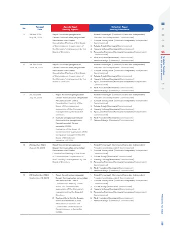 No. TanggalDateAgenda RapatMeeting AgendaKehadiran RapatMeeting Attendance5. 28 Mei 2024May 28, 2024Rapat Koordinasi pengawasan Dewan Komisaris atas pengelolaan Perusahaan oleh Direksi.Coordination Meeting of the Board of Commissioners' supervision of the Company's management by the Board of Directors.1. Rinaldi Firmansyah (Komisaris Utama dan Independen/President and Independent Commissioner)2. Tumpak Simanjuntak (Komisaris Indepeden/ Independent Commissioner)3. Tutuka Ariadji (Komisaris/Commissioner)4. Nanang Untung (Komisaris/Commissioner)5. Agus Joko Pramono (Komisaris Indepeden/Independent Commissioner)6. Abdi Mustakim (Komisaris/Commissioner)7. Paiman Raharjo (Komisaris/Commissioner)6. 28 Juni 2024June 28, 2024Rapat Koordinasi pengawasan Dewan Komisaris atas pengelolaan Perusahaan oleh Direksi.Coordination Meeting of the Board of Commissioners' supervision of the Company's management by the Board of Directors.1. Rinaldi Firmansyah (Komisaris Utama dan Independen/President and Independent Commissioner)2. Tumpak Simanjuntak (Komisaris Indepeden/ Independent Commissioner)3. Tutuka Ariadji (Komisaris/Commissioner)4. Nanang Untung (Komisaris/Commissioner)5. Agus Joko Pramono (Komisaris Indepeden/Independent Commissioner)6. Abdi Mustakim (Komisaris/Commissioner)7. Paiman Raharjo (Komisaris/Commissioner)7. 25 Juli 2024July 25, 20241. Rapat Koordinasi pengawasan Dewan Komisaris atas pengelolaan Perusahaan oleh Direksi. Coordination Meeting of the Board of Commissioners' supervision of the Company's management by the Board of Directors.2. Evaluasi pengawasan Dewan Komisaris atas pengelolaan Perusahaan oleh Direksi semester I 2024. Evaluation of the Board of Commissioners' supervision of the Company's management by the Board of Directors in semester I of 2024.1. Rinaldi Firmansyah (Komisaris Utama dan Independen/President and Independent Commissioner)2. Tumpak Simanjuntak (Komisaris Indepeden/ Independent Commissioner)3. Tutuka Ariadji (Komisaris/Commissioner)4. Nanang Untung (Komisaris/Commissioner)5. Agus Joko Pramono (Komisaris Indepeden/Independent Commissioner)6. Abdi Mustakim (Komisaris/Commissioner)7. Paiman Raharjo (Komisaris/Commissioner)8. 26 Agustus 2024August 26, 2024Rapat Koordinasi pengawasan Dewan Komisaris atas pengelolaan Perusahaan oleh Direksi.Coordination Meeting of the Board of Commissioners' supervision of the Company's management by the Board of Directors.1. Rinaldi Firmansyah (Komisaris Utama dan Independen/President and Independent Commissioner)2. Tumpak Simanjuntak (Komisaris Indepeden/ Independent Commissioner)3. Tutuka Ariadji (Komisaris/Commissioner)4. Nanang Untung (Komisaris/Commissioner)5. Agus Joko Pramono (Komisaris Indepeden/Independent Commissioner)6. Abdi Mustakim (Komisaris/Commissioner)7. Paiman Raharjo (Komisaris/Commissioner)9. 24 September 2024September 24, 20241. Rapat Koordinasi pengawasan Dewan Komisaris atas pengelolaan Perusahaan oleh Direksi. Coordination Meeting of the Board of Commissioners' supervision of the Company's management by the Board of Directors. 2. Realisasi Kerja Komite Dewan Komisaris semester II 2024.Realization of Work of the Committees of the Board of Commissioners in Semester II 2024. 1. Rinaldi Firmansyah (Komisaris Utama dan Independen/President and Independent Commissioner)2. Tumpak Simanjuntak (Komisaris Indepeden/ Independent Commissioner)3. Tutuka Ariadji (Komisaris/Commissioner)4. Nanang Untung (Komisaris/Commissioner)5. Agus Joko Pramono (Komisaris Indepeden/Independent Commissioner)6. Abdi Mustakim (Komisaris/Commissioner)7. Paiman Raharjo (Komisaris/Commissioner)0102030405 Good Corporate Governance Tata kelola Perusahaan0607 PT Pertamina Hulu Energi 399