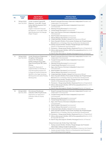 No. TanggalDateAgenda RapatMeeting AgendaKehadiran RapatMeeting Attendance8 18 April 2024April 18, 2024Usulan Investasi Organik BD Regional 1, Zona 2&3 : Proyek Rokan Well Development SLO Bangko Phase 1Organic Investment Proposal BD Regional 1, Zone 2&3: Rokan Well Development SLO Bangko Phase 1 Project1. Rinadi Firmansyah (Komisaris Utama dan Independen/President and Independent Commissioner) 2. Tumpak Simanjuntak (Komisaris Indepeden/Independent Commissioner)3. Nanang Untung (Komisaris/Commissioner)4. Tutuka Ariadji (Komisaris/Commissioner) 5. Agus Joko Pramono (Komisaris Indepeden/Independent Commissioner)6. Abdi Mustakim (Komisaris/Commissioner)7. Paiman Raharjo (Komisaris/Commissioner)8. Chalid Said Salim (Direktur Utama/Chief Executive Officer)9. Danar Dojoadhi (Direktur Perencanaan Strategis dan Pengembangan Bisnis/Director of Strategic Planning and Business Development)10. Awang Lazuardi Direktur (Direktur Pengembangan dan Produksi/Director of Development and Production)11. Muharram J. Panguriseng (Direktur Eksplorasi/Director of Exploration)12. Whisnu Bahriansyah (Direktur SDM & Penunjang Bisnis/Director of HC & Corporate Services)13. Dannif Utojo Danusaputro (Direktur Keuangan/Director of Finance)9 18 April 2024April 18, 2024Usulan Persetujuan Pelaksanaan Pengalihan Participating Interest (PI) 10% kepada BUMD di Wilayah Kerja (WK) Ogan Komering dan WK Jambi MerangProposal for Approval of Implementation of Transfer of 10% Participating Interest (PI) to Regional Owned Enterprises (BUMD) in the Ogan Komering Working Area and Jambi Merang Working Area 1. Rinadi Firmansyah (Komisaris Utama dan Independen/President and Independent Commissioner) 2. Tumpak Simanjuntak (Komisaris Indepeden/Independent Commissioner)3. Nanang Untung (Komisaris/Commissioner)4. Tutuka Ariadji (Komisaris/Commissioner) 5. Agus Joko Pramono (Komisaris Indepeden/Independent Commissioner)6. Abdi Mustakim (Komisaris/Commissioner)7. Paiman Raharjo (Komisaris/Commissioner)8. Chalid Said Salim (Direktur Utama/Chief Executive Officer)9. Danar Dojoadhi (Direktur Perencanaan Strategis dan Pengembangan Bisnis/Director of Strategic Planning and Business Development)10. Awang Lazuardi Direktur (Direktur Pengembangan dan Produksi/Director of Development and Production)11. Muharram J. Panguriseng (Direktur Eksplorasi/Director of Exploration)12. Whisnu Bahriansyah (Direktur SDM & Penunjang Bisnis/Director of HC & Corporate Services)13. Dannif Utojo Danusaputro (Direktur Keuangan/Director of Finance)10 26 April 2024April 26, 2024Permohonan Persetujuan Indicative Offer Proyek DumaiApplication for Approval of Indicative Offer for Dumai Project1. Rinadi Firmansyah (Komisaris Utama dan Independen/President and Independent Commissioner) 2. Tumpak Simanjuntak (Komisaris Indepeden/Independent Commissioner)3. Nanang Untung (Komisaris/Commissioner)4. Tutuka Ariadji (Komisaris/Commissioner) 5. Agus Joko Pramono (Komisaris Indepeden/Independent Commissioner)6. Abdi Mustakim (Komisaris/Commissioner)7. Paiman Raharjo (Komisaris/Commissioner)8. Chalid Said Salim (Direktur Utama/Chief Executive Officer)9. Danar Dojoadhi (Direktur Perencanaan Strategis dan Pengembangan Bisnis/Director of Strategic Planning and Business Development)10. Muharram J. Panguriseng (Direktur Eksplorasi/Director of Exploration)11. Whisnu Bahriansyah (Direktur SDM & Penunjang Bisnis/Director of HC & Corporate Services)12. Dannif Utojo Danusaputro (Direktur Keuangan/Director of Finance)Dewan Komisaris dan Direksi Yang Tidak Hadir:1. Awang Lazuardi Direktur (Direktur Pengembangan dan Produksi) dikarenakan sedang mengikuti agenda lainMembers of Board of Commissioners and Board of Directors Not Present:1. Awang Lazuardi Direktur (Director of Development and Production) due to attending another agenda0102030405 Good Corporate Governance Tata kelola Perusahaan0607 PT Pertamina Hulu Energi 405