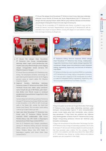 PT Elnusa Tbk sebagai Anak Perusahaan PT Pertamina Hulu Energi, dipercaya melakukan pekerjaan survei Seismik 2D Amalia dan Audio Magnetotelurik oleh PT Pertamina EP, dengan estimasi panjang lintasan sekitar 296 km yang melintasi 28 Desa di 6 Kecamatan yang terdapat di Kabupaten Muara Enim dan Ogan Komering Ulu.PT Elnusa Tbk as a subsidiary of PT Pertamina Hulu Energi, is trusted to carry out the Amalia 2D Seismic and Audio Magnetotelluric survey work by PT Pertamina EP, with an estimated track length of around 296 km crossing 28 villages in 6 sub-districts in Muara Enim and Ogan Komering Ulu Regencies.FEB23a. PT Elnusa Tbk sebagai Anak Perusahaan PT Pertamina Hulu Energi, mengembangkan teknologi dalam negeri untuk pembersihan dan inspeksi pipa yang dikenal dengan proses Pigging dengan menggunakan benda bernama PIG (Pipeline Inspector Gauge).PT Elnusa Tbk as a subsidiary of PT Pertamina Hulu Energi, has developed domestic technology for pipe cleaning and inspection known as the Pigging process using an object called PIG (Pipeline Inspector Gauge).b. Regional Sumatra Subholding Upstream Pertamina melalui PT Pertamina Hulu Rokan (PHR) membuat inovasi baru dalam upaya pemboran sumur minyak dan gas di WK Rokan, yakni Openhole Slotter Liner (Pensl). Inovasi ini membuat penghematan biaya pemboran hingga Rp4,5 miliar setiap sumurnya.Sumatra Regional Subholding Upstream Pertamina through PT Pertamina Hulu Rokan (PHR) has made a new innovation in the effort to drill oil and gas wells in the Rokan WK, namely the Open-hole Slotter Liner (Pensl). This innovation saves drilling costs of up to Rp4.5 billion per well.c. Salah satu Anak Perusahaan PT Pertamina Hulu Energi yaitu PT Pertamina Drilling Services Indonesia (PDSI) melaksanakan Tajak Sumur Perdana Banyu Urip Infill Clastic di Bojonegoro bersama Exxon Mobil Cepu Limited (EMCL).One of PT Pertamina Hulu Energi's subsidiaries, namely PT Pertamina Drilling Services Indonesia (PDSI), carried out the first drilling of the Tajak Sumur Perdana Banyu Urip Infill Clastic in Bojonegoro together with Exxon Mobil Cepu Limited (EMCL).MAR1PT Pertamina Drilling Services Indonesia (PDSI) sebagai Anak Perusahaan PT Pertamina Hulu Energi, melaksanakan Inaguration Ceremony untuk 2 rig baru dengan kapasitas 750 horsepower sebagai upaya menyukseskan proyek Integrated Drilling, Engineering, Supervisory and Services di Pertamina Hulu Rokan.PT Pertamina Drilling Services Indonesia (PDSI) as a subsidiary of PT Pertamina Hulu Energi, held an Inauguration Ceremony for 2 new rigs with a capacity of 750 horsepower as an effort to make the Integrated Drilling, Engineering, Supervisory and Services project at Pertamina Hulu Rokan a success.MAR4IT Days merupakan acara tahunan Fungsi Information TechnologyPT Pertamina Hulu Energi selaku Subholding Upstream, yang bertujuan memperkenalkan layanan IT serta memperkenalkan produk inovasi digital yang telah memberikan value creation bagi perusahaan. IT Days terdiri dari exhibition dan talkshowyang diselenggarakan di Kantor Pusat PT. Pertamina Hulu Energi dengan mengundang pembicara internal dan eksternal yang kompeten di bidangnya.IT Days is an annual event of the Information Technology Function of PT Pertamina Hulu Energi as Subholding Upstream, which aims to introduce IT services and introduce digital innovation products that have provided value creation for the company. IT Days consists of an exhibition and talk show held at the Head Office of PT. Pertamina Hulu Energi by inviting internal and external speakers who are competent in their fields.MAR5-601 2024 Performance Performa 2024020304050607Laporan Tahunan %u2022 Annual Report 38PT Pertamina Hulu Energi 39