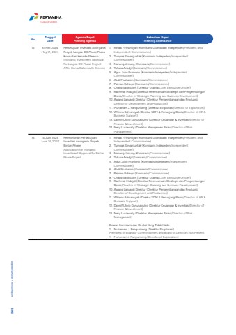 No. TanggalDateAgenda RapatMeeting AgendaKehadiran RapatMeeting Attendance15 31 Mei 2024May 31, 2024Persetujuan Investasi Anorganik Proyek Langsa-BO Phase Pasca Konsultasi kepada SteercoInorganic Investment Approval for Langsa-BO Phase Project After Consultation with Steerco1. Rinadi Firmansyah (Komisaris Utama dan Independen/President and Independent Commissioner) 2. Tumpak Simanjuntak (Komisaris Indepeden/Independent Commissioner)3. Nanang Untung (Komisaris/Commissioner)4. Tutuka Ariadji (Komisaris/Commissioner) 5. Agus Joko Pramono (Komisaris Indepeden/Independent Commissioner)6. Abdi Mustakim (Komisaris/Commissioner)7. Paiman Raharjo (Komisaris/Commissioner)8. Chalid Said Salim (Direktur Utama/Chief Executive Officer)9. Rachmat Hidajat (Direktur Perencanaan Strategis dan Pengembangan Bisnis/Director of Strategic Planning and Business Development)10. Awang Lazuardi Direktur (Direktur Pengembangan dan Produksi/Director of Development and Production)11. Muharram J. Panguriseng (Direktur Eksplorasi/Director of Exploration)12. Whisnu Bahransyah (Direkur SDM & Penunjang Bisnis/Director of HR & Business Support)13. Dannif Utojo Danusaputro (Direktur Keuangan & Investasi/Director of Finance & Investment)14. Mery Luciawaty (Direktur Manajemen Risiko/Director of Risk Management)16 14 Juni 2024June 14, 2024Permohonan Persetujuan Investasi Anorganik Proyek Bintan PhaseApplication for Inorganic Investment Approval for Bintan Phase Project1. Rinadi Firmansyah (Komisaris Utama dan Independen/President and Independent Commissioner) 2. Tumpak Simanjuntak (Komisaris Indepeden/Independent Commissioner)3. Nanang Untung (Komisaris/Commissioner)4. Tutuka Ariadji (Komisaris/Commissioner) 5. Agus Joko Pramono (Komisaris Indepeden/Independent Commissioner)6. Abdi Mustakim (Komisaris/Commissioner)7. Paiman Raharjo (Komisaris/Commissioner)8. Chalid Said Salim (Direktur Utama/Chief Executive Officer)9. Rachmat Hidajat (Direktur Perencanaan Strategis dan Pengembangan Bisnis/Director of Strategic Planning and Business Development)10. Awang Lazuardi Direktur (Direktur Pengembangan dan Produksi/Director of Development and Production)11. Whisnu Bahransyah (Direkur SDM & Penunjang Bisnis/Director of HR & Business Support)12. Dannif Utojo Danusaputro (Direktur Keuangan & Investasi/Director of Finance & Investment)13. Mery Luciawaty (Direktur Manajemen Risiko/Director of Risk Management)Dewan Komisaris dan Direksi Yang Tidak Hadir:1. Muharram J. Panguriseng (Direktur Eksplorasi)Members of Board of Commissioners and Board of Directors Not Present:1. Muharram J. Panguriseng (Director of Exploration)Laporan Tahunan %u2022 Annual Report 408HULU ENERGI