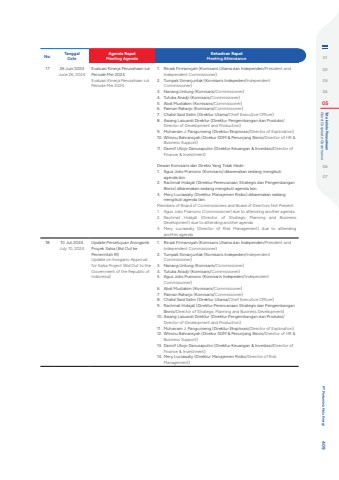 No. TanggalDateAgenda RapatMeeting AgendaKehadiran RapatMeeting Attendance17 26 Juni 2024June 26, 2024Evaluasi Kinerja Perusahaan s.d Periode Mei 2024Evaluasi Kinerja Perusahaan s.d Periode Mei 20241. Rinadi Firmansyah (Komisaris Utama dan Independen/President and Independent Commissioner) 2. Tumpak Simanjuntak (Komisaris Indepeden/Independent Commissioner)3. Nanang Untung (Komisaris/Commissioner)4. Tutuka Ariadji (Komisaris/Commissioner) 5. Abdi Mustakim (Komisaris/Commissioner)6. Paiman Raharjo (Komisaris/Commissioner)7. Chalid Said Salim (Direktur Utama/Chief Executive Officer)8. Awang Lazuardi Direktur (Direktur Pengembangan dan Produksi/Director of Development and Production)9. Muharram J. Panguriseng (Direktur Eksplorasi/Director of Exploration)10. Whisnu Bahransyah (Direkur SDM & Penunjang Bisnis/Director of HR & Business Support)11. Dannif Utojo Danusaputro (Direktur Keuangan & Investasi/Director of Finance & Investment)Dewan Komisaris dan Direksi Yang Tidak Hadir:1. Agus Joko Pramono (Komisaris) dikarenakan sedang mengikuti agenda lain.2. Rachmat Hidajat (Direktur Perencanaan Strategis dan Pengembangan Bisnis) dikarenakan sedang mengikuti agenda lain.3. Mery Luciawaty (Direktur Manajemen Risiko) dikarenakan sedang mengikuti agenda lain.Members of Board of Commissioners and Board of Directors Not Present:1. Agus Joko Pramono (Commissioner) due to attending another agenda2. Rachmat Hidajat (Director of Strategic Planning and Business Development) due to attending another agenda3. Mery Luciawaty (Director of Risk Management) due to attending another agenda18 10 Juli 2024July 10, 2024Update Persetujuan Anorganik Proyek Salsa (Bid Out ke Pemerintah RI)Update on Inorganic Approval for Salsa Project (Bid Out to the Government of the Republic of Indonesia)1. Rinadi Firmansyah (Komisaris Utama dan Independen/President and Independent Commissioner) 2. Tumpak Simanjuntak (Komisaris Indepeden/Independent Commissioner)3. Nanang Untung (Komisaris/Commissioner)4. Tutuka Ariadji (Komisaris/Commissioner) 5. Agus Joko Pramono (Komisaris Indepeden/Independent Commissioner)6. Abdi Mustakim (Komisaris/Commissioner)7. Paiman Raharjo (Komisaris/Commissioner)8. Chalid Said Salim (Direktur Utama/Chief Executive Officer)9. Rachmat Hidajat (Direktur Perencanaan Strategis dan Pengembangan Bisnis/Director of Strategic Planning and Business Development)10. Awang Lazuardi Direktur (Direktur Pengembangan dan Produksi/Director of Development and Production)11. Muharram J. Panguriseng (Direktur Eksplorasi/Director of Exploration)12. Whisnu Bahransyah (Direkur SDM & Penunjang Bisnis/Director of HR & Business Support)13. Dannif Utojo Danusaputro (Direktur Keuangan & Investasi/Director of Finance & Investment)14. Mery Luciawaty (Direktur Manajemen Risiko/Director of Risk Management)0102030405 Good Corporate Governance Tata kelola Perusahaan0607 PT Pertamina Hulu Energi 409