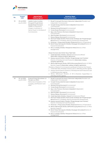 No. TanggalDateAgenda RapatMeeting AgendaKehadiran RapatMeeting Attendance19 25 Juli 2024July 25, 2024Update Usulan Investasi Anorganik Proyek Saman kepada Dewan KomisarisUpdate on Proposal for Inorganic Investment of Saman Project to the Board of Commissioners1. Rinadi Firmansyah (Komisaris Utama dan Independen/President and Independent Commissioner) 2. Tumpak Simanjuntak (Komisaris Indepeden/Independent Commissioner)3. Nanang Untung (Komisaris/Commissioner)4. Tutuka Ariadji (Komisaris/Commissioner) 5. Agus Joko Pramono (Komisaris Indepeden/Independent Commissioner)6. Abdi Mustakim (Komisaris/Commissioner)7. Paiman Raharjo (Komisaris/Commissioner)8. Rachmat Hidajat (Direktur Perencanaan Strategis dan Pengembangan Bisnis/Director of Strategic Planning and Business Development)9. Muharram J. Panguriseng (Direktur Eksplorasi/Director of Exploration)10. Dannif Utojo Danusaputro (Direktur Keuangan & Investasi/Director of Finance & Investment)11. Mery Luciawaty (Direktur Manajemen Risiko/Director of Risk Management)Dewan Komisaris dan Direksi Yang Tidak Hadir:1. Chalid Said Salim (Direktur Utama/Chief Executive Officer) dikarenakan sedang mengikuti agenda lain2. Awang Lazuardi Direktur (Direktur Pengembangan dan Produksi/Director of Development and Production) dikarenakan sedang mengikuti agenda lain.3. Whisnu Bahransyah (Direkur SDM & Penunjang Bisnis/Director of HR & Business Support) dikarenakan sedang mengikuti agenda lain.Members of Board of Commissioners and Board of Directors Not Present:1. Chalid Said Salim (President Director) due to attending another agenda2. Awang Lazuardi Director (Director of Development and Production) due to attending another agenda3. Whisnu Bahriansyah (Director of HR & Business Support)due to attending another agenda20 30 Juli 2024July 30, 2024Evaluasi Kinerja Perusahaan s.d Periode Juni 2024Performance Evaluation of the Company until Period of June 2024 1. Rinadi Firmansyah (Komisaris Utama dan Independen/President and Independent Commissioner) 2. Tumpak Simanjuntak (Komisaris Indepeden/Independent Commissioner)3. Nanang Untung (Komisaris/Commissioner)4. Tutuka Ariadji (Komisaris/Commissioner) 5. Agus Joko Pramono (Komisaris Indepeden/Independent Commissioner)6. Abdi Mustakim (Komisaris/Commissioner)7. Paiman Raharjo (Komisaris/Commissioner)8. Chalid Said Salim (Direktur Utama/Chief Executive Officer)9. Rachmat Hidajat (Direktur Perencanaan Strategis dan Pengembangan Bisnis/Director of Strategic Planning and Business Development)10. Awang Lazuardi Direktur (Direktur Pengembangan dan Produksi/Director of Development and Production)11. Muharram J. Panguriseng (Direktur Eksplorasi/Director of Exploration)12. Whisnu Bahransyah (Direkur SDM & Penunjang Bisnis/Director of HR & Business Support)13. Dannif Utojo Danusaputro (Direktur Keuangan & Investasi/Director of Finance & Investment)14. Mery Luciawaty (Direktur Manajemen Risiko/Director of Risk Management) Laporan Tahunan %u2022 Annual Report 410HULU ENERGI