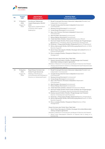 No. TanggalDateAgenda RapatMeeting AgendaKehadiran RapatMeeting Attendance23 12 Agustus 2024August 12, 2024Persetujuan Pelaksanaan Capital Redemption DSLNG 2024Approval for Implementation of DSLNG 2024 Capital Redemption 1. Rinadi Firmansyah (Komisaris Utama dan Independen/President and Independent Commissioner) 2. Tumpak Simanjuntak (Komisaris Indepeden/Independent Commissioner)3. Nanang Untung (Komisaris/Commissioner)4. Tutuka Ariadji (Komisaris/Commissioner) 5. Agus Joko Pramono (Komisaris Indepeden/Independent Commissioner)6. Abdi Mustakim (Komisaris/Commissioner)7. Paiman Raharjo (Komisaris/Commissioner)8. Chalid Said Salim (Direktur Utama/Chief Executive Officer)9. Rachmat Hidajat (Direktur Perencanaan Strategis dan Pengembangan Bisnis/Director of Strategic Planning and Business Development)10. Muharram J. Panguriseng (Direktur Eksplorasi/Director of Exploration)11. Whisnu Bahransyah (Direkur SDM & Penunjang Bisnis/Director of HR & Business Support)12. Dannif Utojo Danusaputro (Direktur Keuangan & Investasi/Director of Finance & Investment)13. Mery Luciawaty (Direktur Manajemen Risiko/Director of Risk Management)Dewan Komisaris dan Direksi Yang Tidak Hadir:1. Awang Lazuardi Direktur (Direktur Pengembangan dan Produksi) dikarenakan sedang mengikuti agenda lainMembers of Board of Commissioners and Board of Directors Not Present:1. Awang Lazuardi Director (Director of Development and Production) due to attending another agenda24 16 Agustus 2024August 16, 2024Rapat Dewan Komisaris dan Direksi Proyek SamarindaMeeting of the Board of Commissioners and the Board of Directors on Samarinda Project1. Rinadi Firmansyah (Komisaris Utama dan Independen/President and Independent Commissioner) 2. Tumpak Simanjuntak (Komisaris Indepeden/Independent Commissioner)3. Nanang Untung (Komisaris/Commissioner)4. Tutuka Ariadji (Komisaris/Commissioner) 5. Agus Joko Pramono (Komisaris Indepeden/Independent Commissioner)6. Abdi Mustakim (Komisaris/Commissioner)7. Paiman Raharjo (Komisaris/Commissioner)8. Chalid Said Salim (Direktur Utama/Chief Executive Officer)9. Rachmat Hidajat (Direktur Perencanaan Strategis dan Pengembangan Bisnis/Director of Strategic Planning and Business Development)10. Awang Lazuardi Direktur (Direktur Pengembangan dan Produksi/Director of Development and Production)11. Muharram J. Panguriseng (Direktur Eksplorasi/Director of Exploration)12. Whisnu Bahransyah (Direkur SDM & Penunjang Bisnis/Director of HR & Business Support)13. Mery Luciawaty (Direktur Manajemen Risiko/Director of Risk Management)Dewan Komisaris dan Direksi Yang Tidak Hadir:1. Dannif Utojo Danusaputro (Direktur Keuangan & Investasi)dikarenakan sedang mengikuti agenda lainMembers of Board of Commissioners and Board of Directors Not Present:1. Dannif Utojo Danusaputro (Director of Finance) due to being on a Laporan Tahunan business trip%u2022 Annual Report 412HULU ENERGI